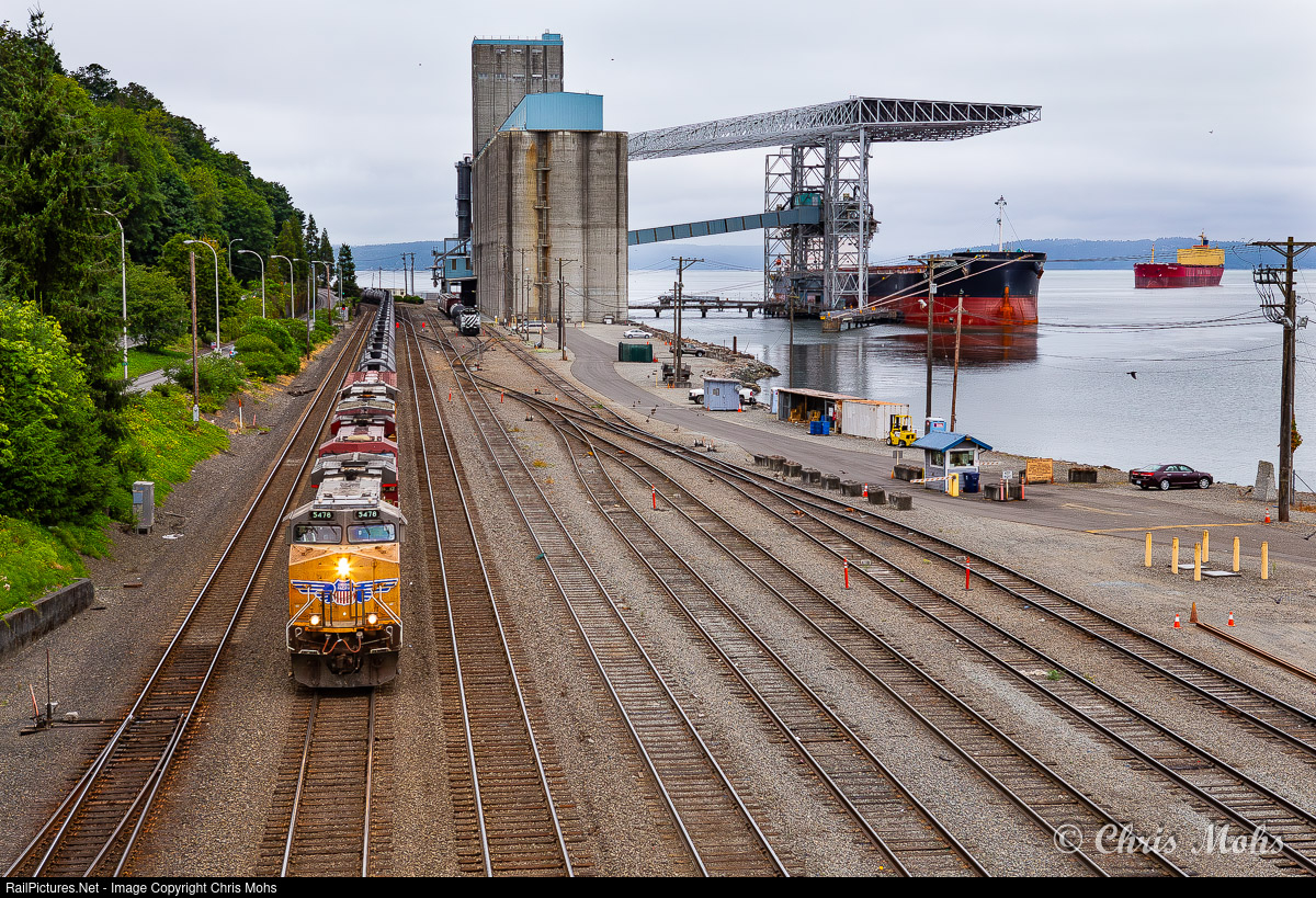 Northbound Union Pacific ES44AC No.5478 rolls its string of Cans past the Tacoma Grain Terminal and Grain inspection Station. One ship is tied to the dock while another waits offshore in Commencement Bay.