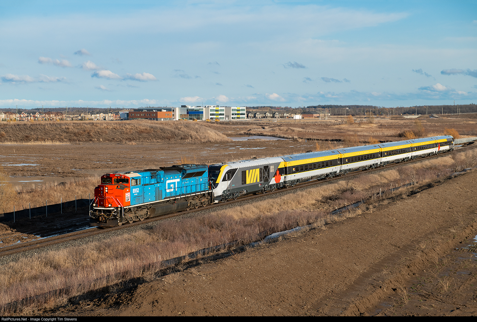 | Wearing GTW blue, CN SD70M-2 8952 cruises east (compass direction north) on CN's Halton Sub with train P276 consisting of brand new VIA Rail Canada "Venture" trainset #27 heading towards Montreal. |