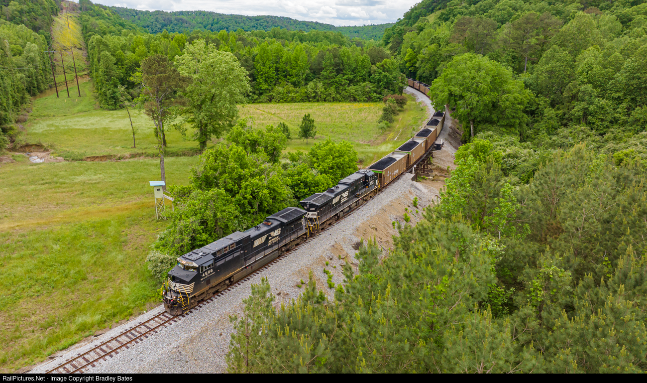 | After more than 10 years of seeing no traffic other than storage car movements, Norfolk Southern is back to running coal trains along the Berry Branch. Here train 702 is seen heading east into Oakman, AL. with 105 loads bound for Mobile. |