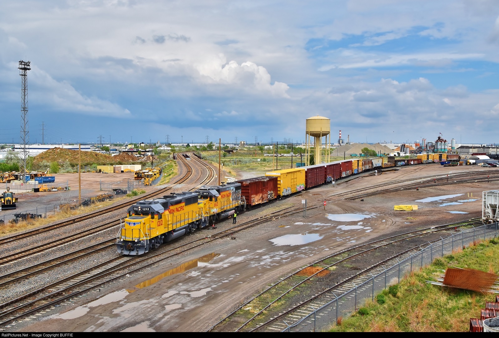 Thunderstorms have just moved through the North Yard in Denver, Colorado as UP 1212 (GP39-2) works on a cut of cars.