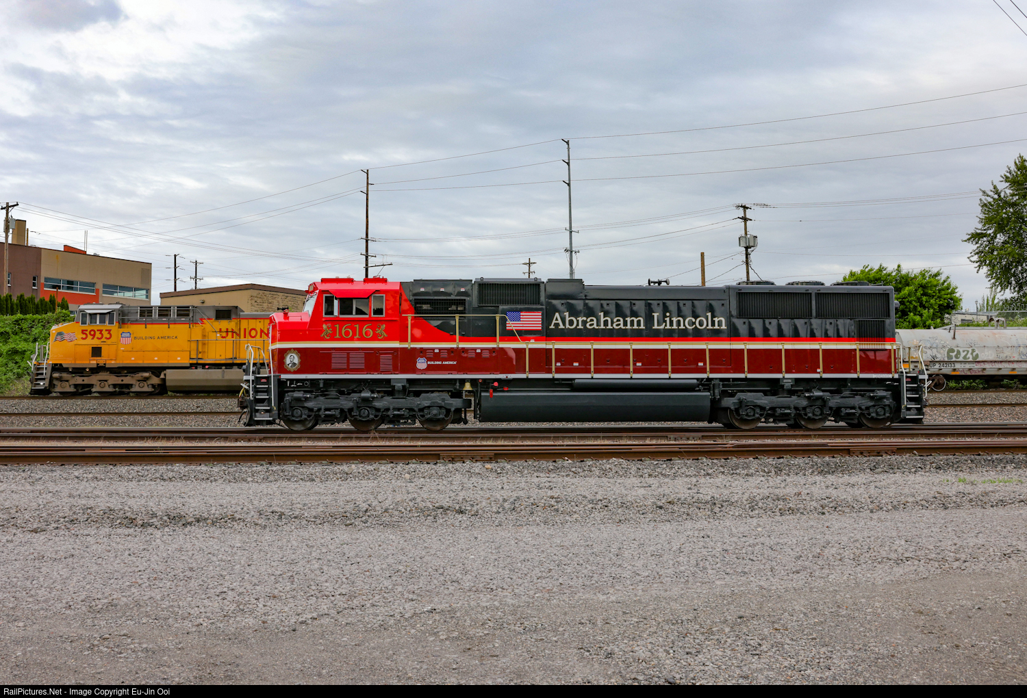 | After a day on display for National Train Day begin, a freshly painted UP 1616 was pulled off the turntable and turned over to a UP crew. While getting ready to depart a UP manifest passes behind. |