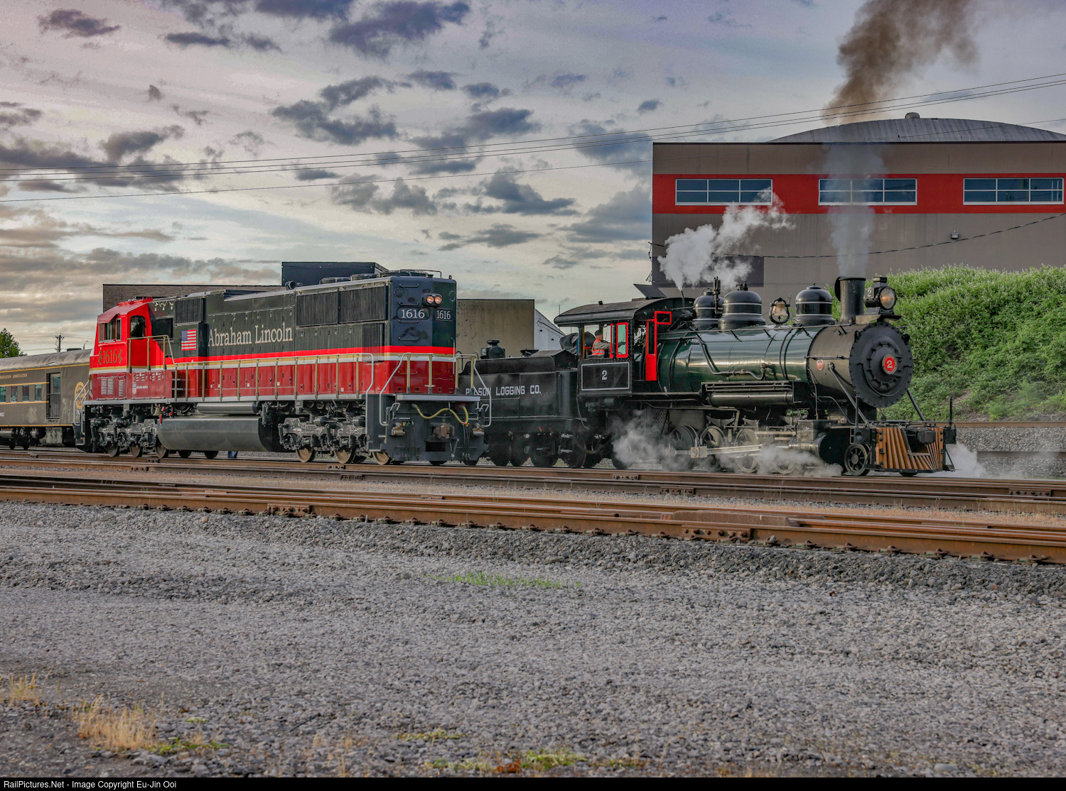| As UP 1616 starts to head for the switch to the mainline, Polson Logging Co. #2 heads back into the gates at the Oregon Rail Heritage Center. |
