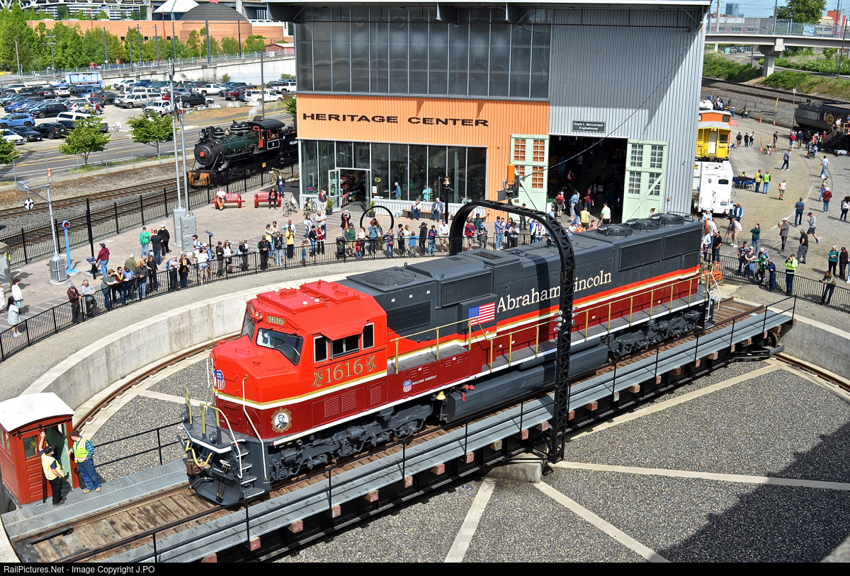 Union Pacific's latest heritage unit, the Abraham Lincoln 1616 to honor the 16th US President, takes a spin on the turntable during it's unveiling on National Train Day.