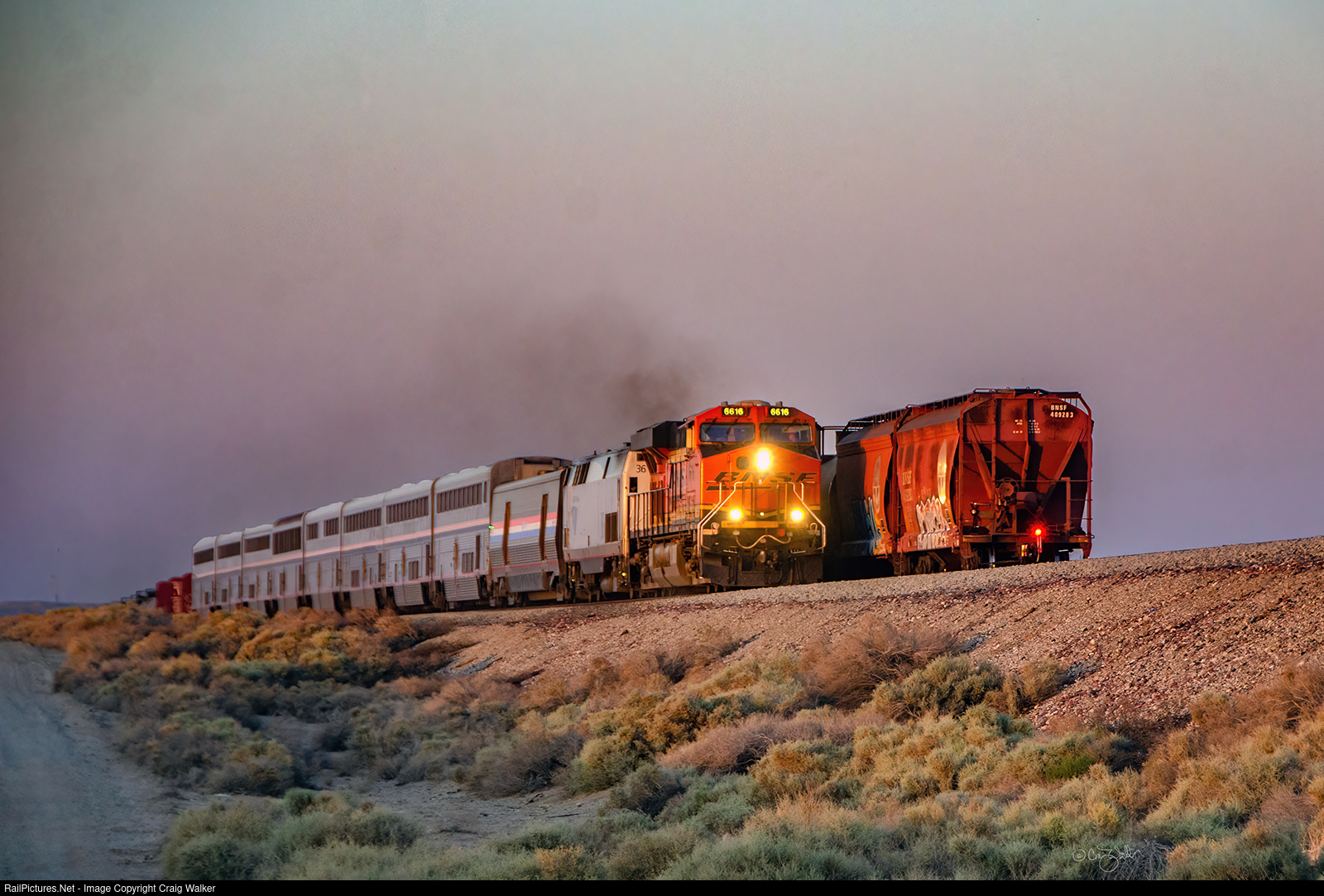 It is 7:59 pm (19:59) ... and still 91ºF (32.7ºC), as this is the Mojave Desert, after all! ... and Amtrak train 3, the westbound Southwest Chief, meeting an eastbound BNSF freight with just seconds of sunlight left in the day, catches the last few seconds of sunlight as it runs a bit behind schedule ... in fact, 16 hours behind schedule. Due to a "locked axle," AMTK P42DC 137 was set out at Mendota IL, and BNSF ES44C4 6616 taken from a light engine move there and recruited to help AMTK P42DC 36 with this 9-car train. Unfortunately, of course, freight diesels cannot operate at passenger train speeds, so this already late train proceeded to fall further behind schedule, adhering to the old adage that "late trains get later."