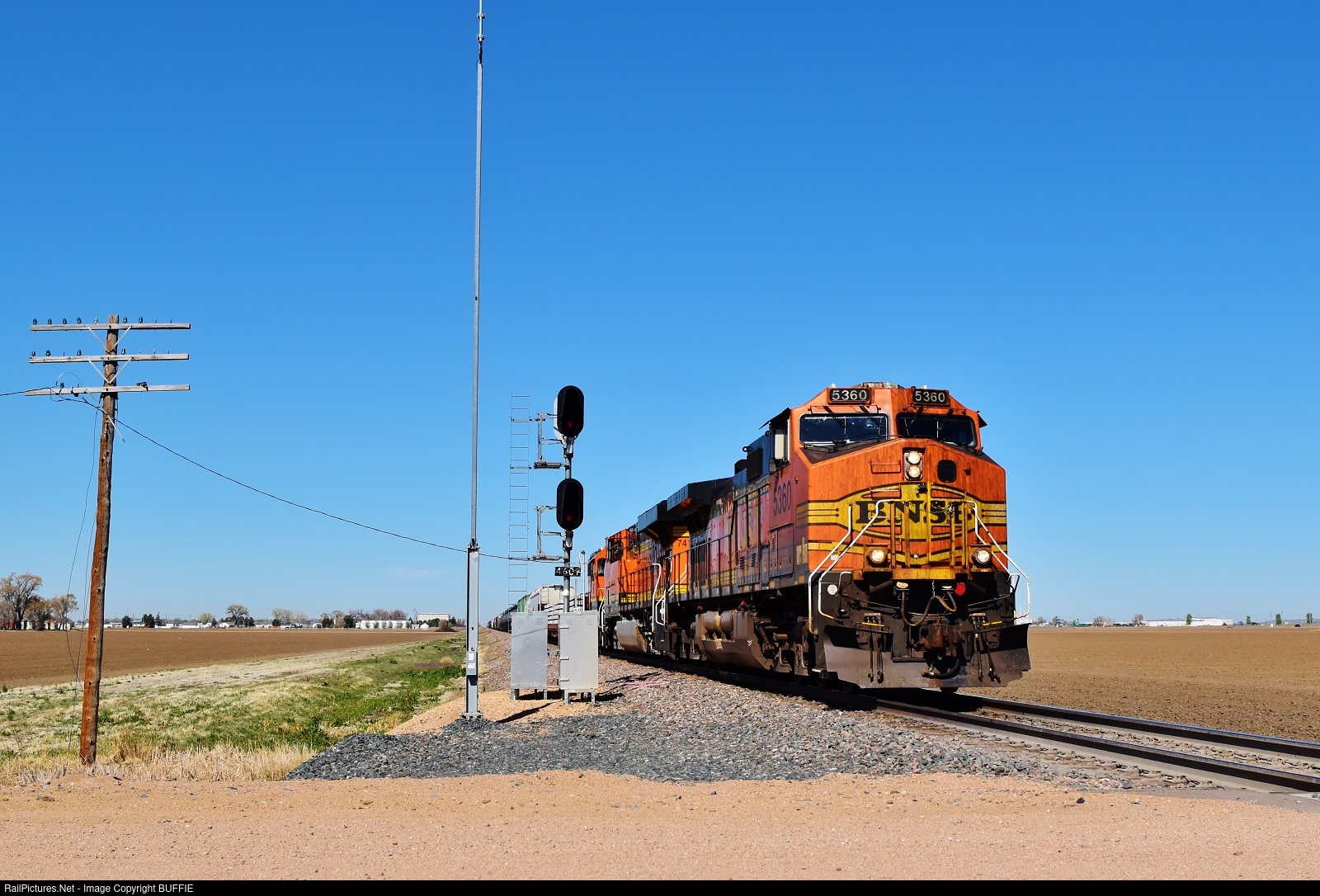 BNSF 5360 (Dash9) runs east on the Brush Sub in Brush, Colorado.