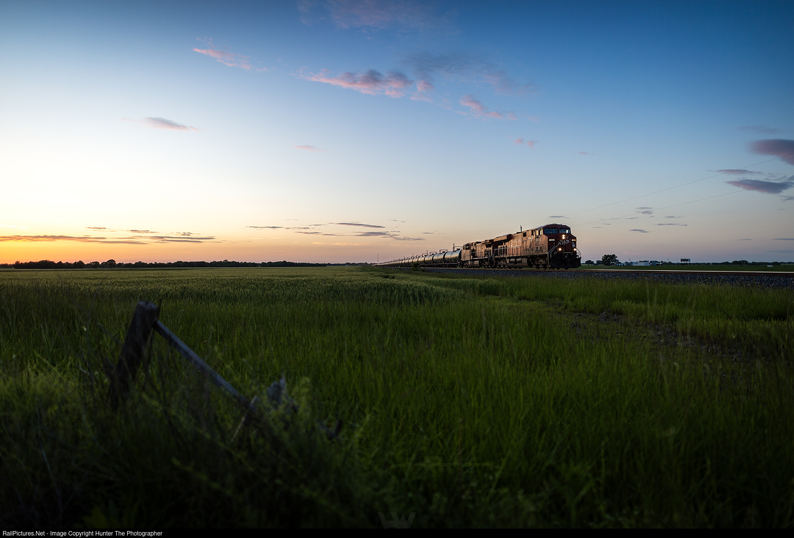 | Southbound CPKC crude oil train 576 cruises into the small town of Asbury, MO just after sunset on the warm evening of Sunday, May 11, 2025.