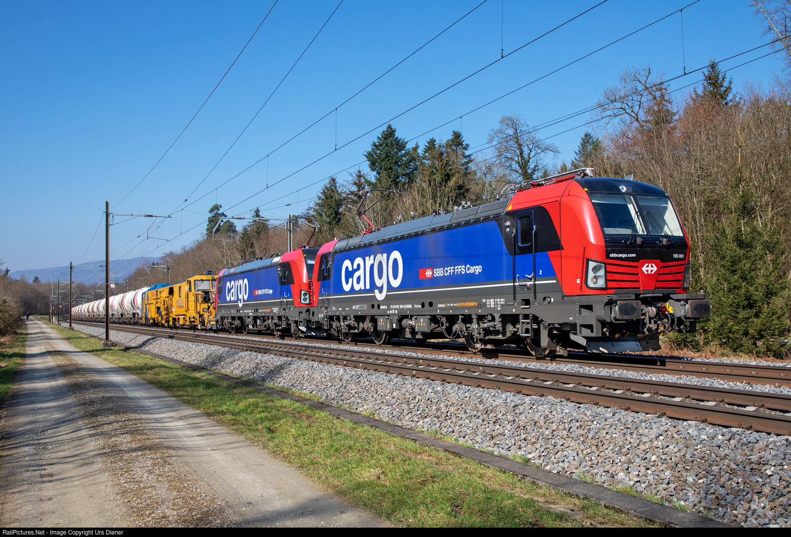 | The two new Simens Vectron AC locomotives of SBB Cargo, 193 051 and 193 055, are on the way with the freight train 60021 from Lausanne shuntingyard to Limmattal shuntingyard. |