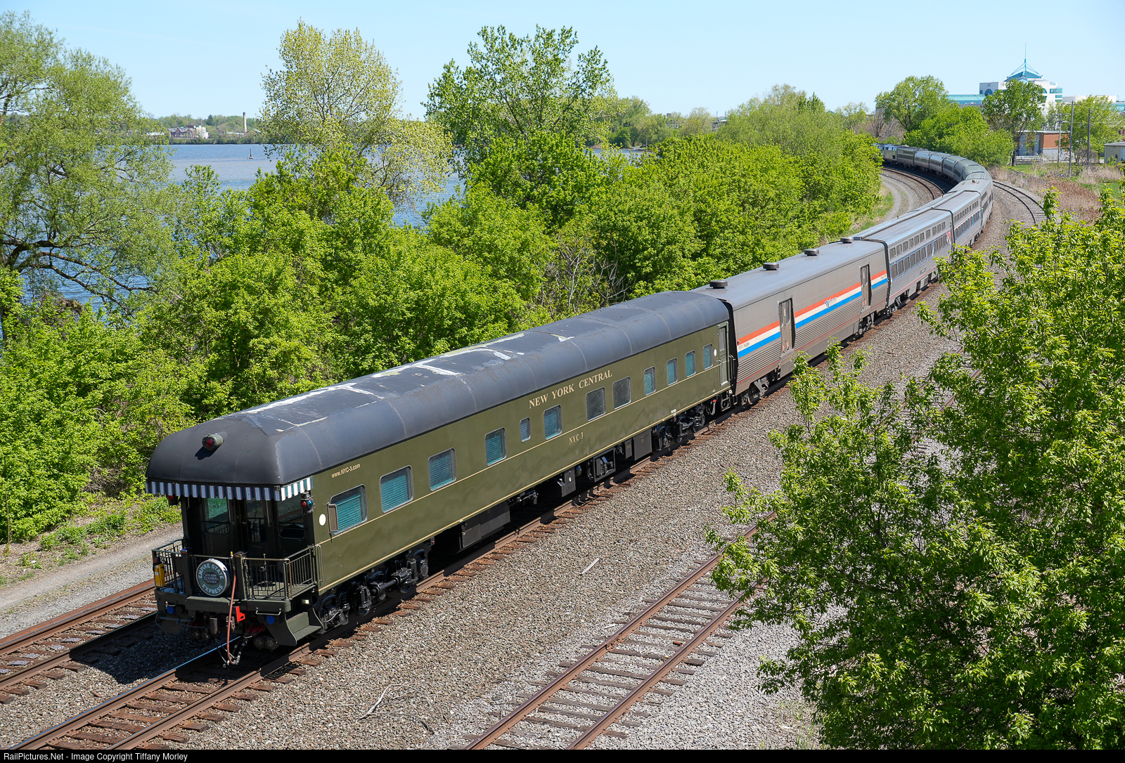 | The Mother's Day Lake Shore Limited carries a private railway car built for the last of the Vanderbilts to run the New York Central Railroad. This car is operated in private charter service throughout North America. In this view, they follow along the Onondaga Lake and the high point of Destiny USA mall is seen in the distance. |