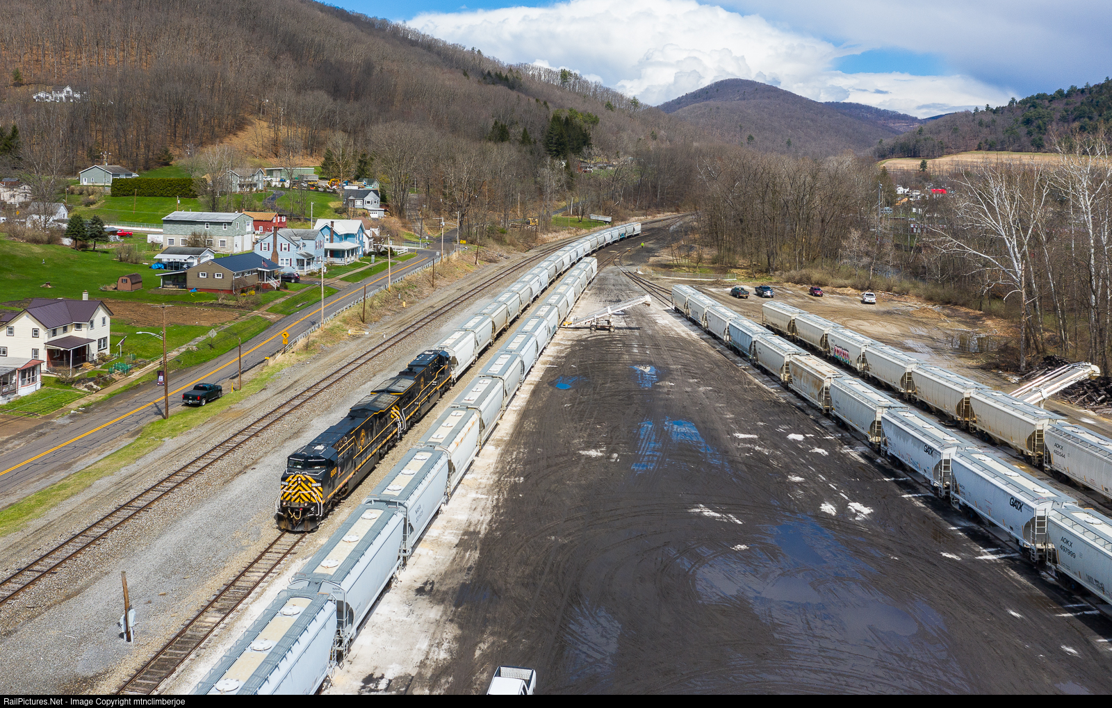 | Led by a pair of AC6000's, the WNYP's OL-2 crew has arrived at the transload in Emporium, Pennsylvania with a train of frac sand loads. After pulling in on the siding, the crew will run around the pull empties and spot loads from the north end of the facility. |