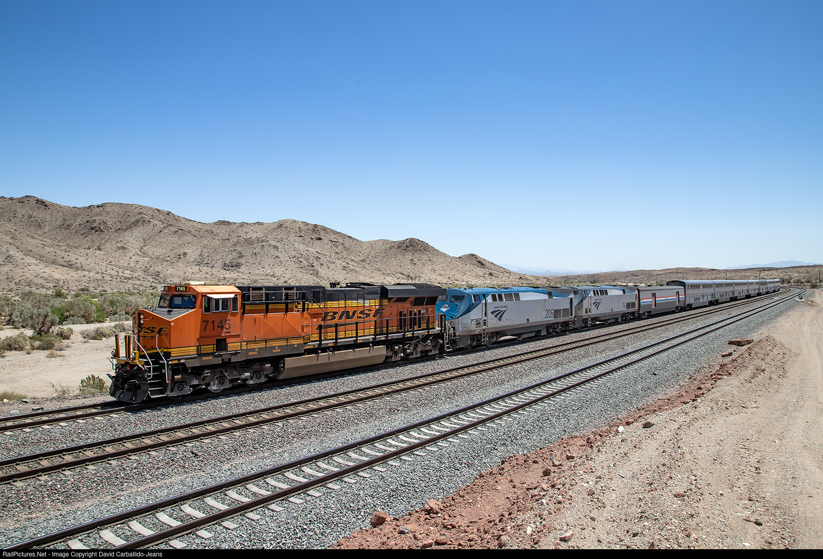 | Running 11 hours and 30 minutes behind schedule out of Needles, Amtrak's westbound Southwest Chief climbs Goffs Hill at Klinefelter with BNSF 7145 on the point. |