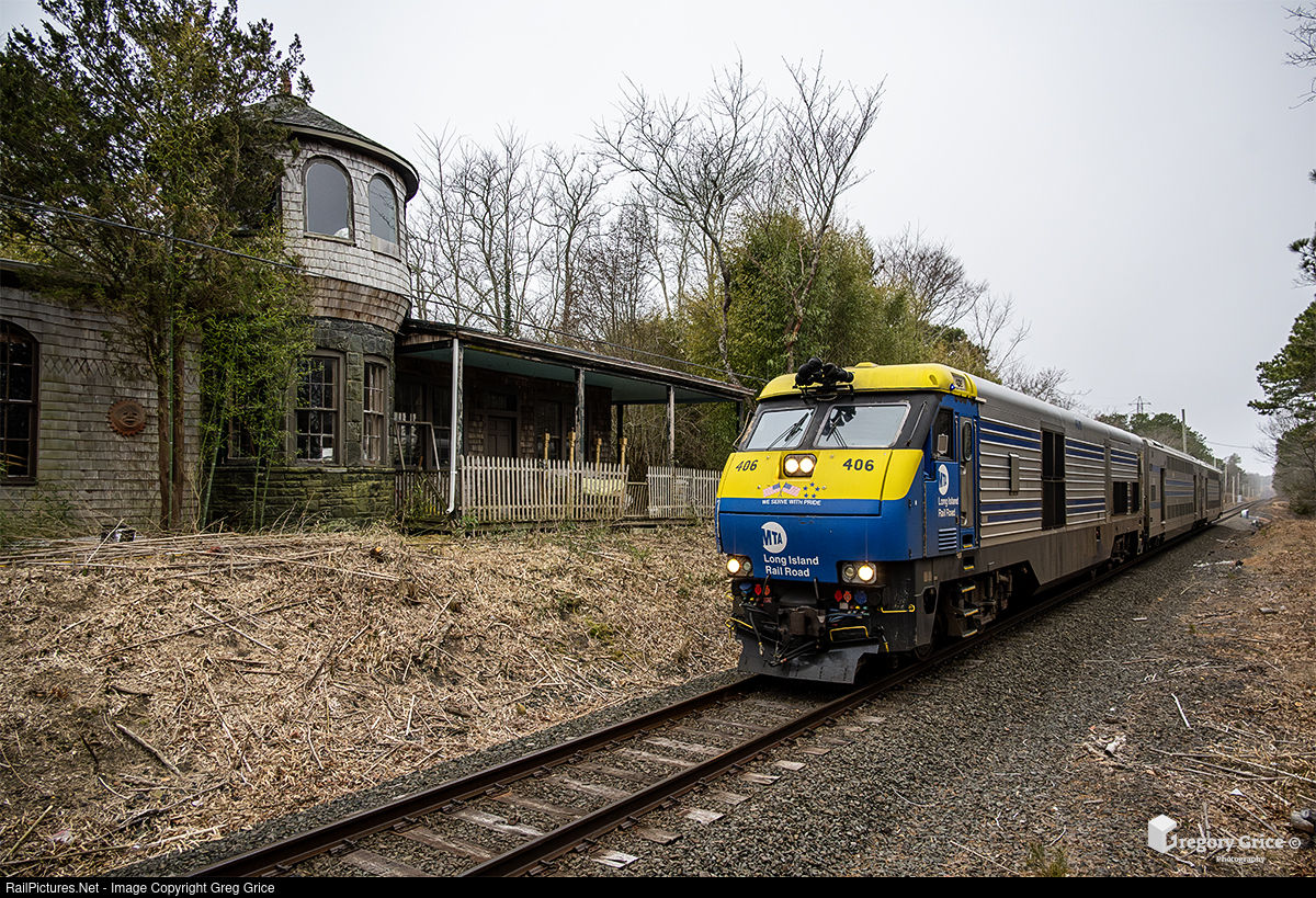 On a foggy March 31st, 2025, Long Island Rail Road "South Fork Commuter Connection" train 92, led by EMD DE30AC 406, passes the former station house at Shinnecock Hills, New York on the Montauk Line. Originally opened around 1887, the station closed in 1938 and was later repurposed as a U.S. Post Office before becoming a private residence in 2013. Previously hidden by bamboo, the north side of the structure has recently been cleared and is once again visible from passing trains.