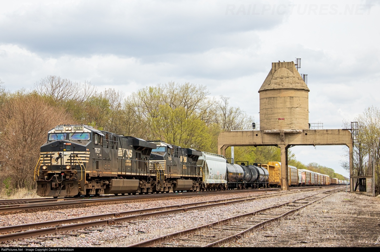 | NS 7637 (ES44AC) leads a combined westbound manifest / empty coal train under the former C&NW coaling tower in Nelson, IL. |