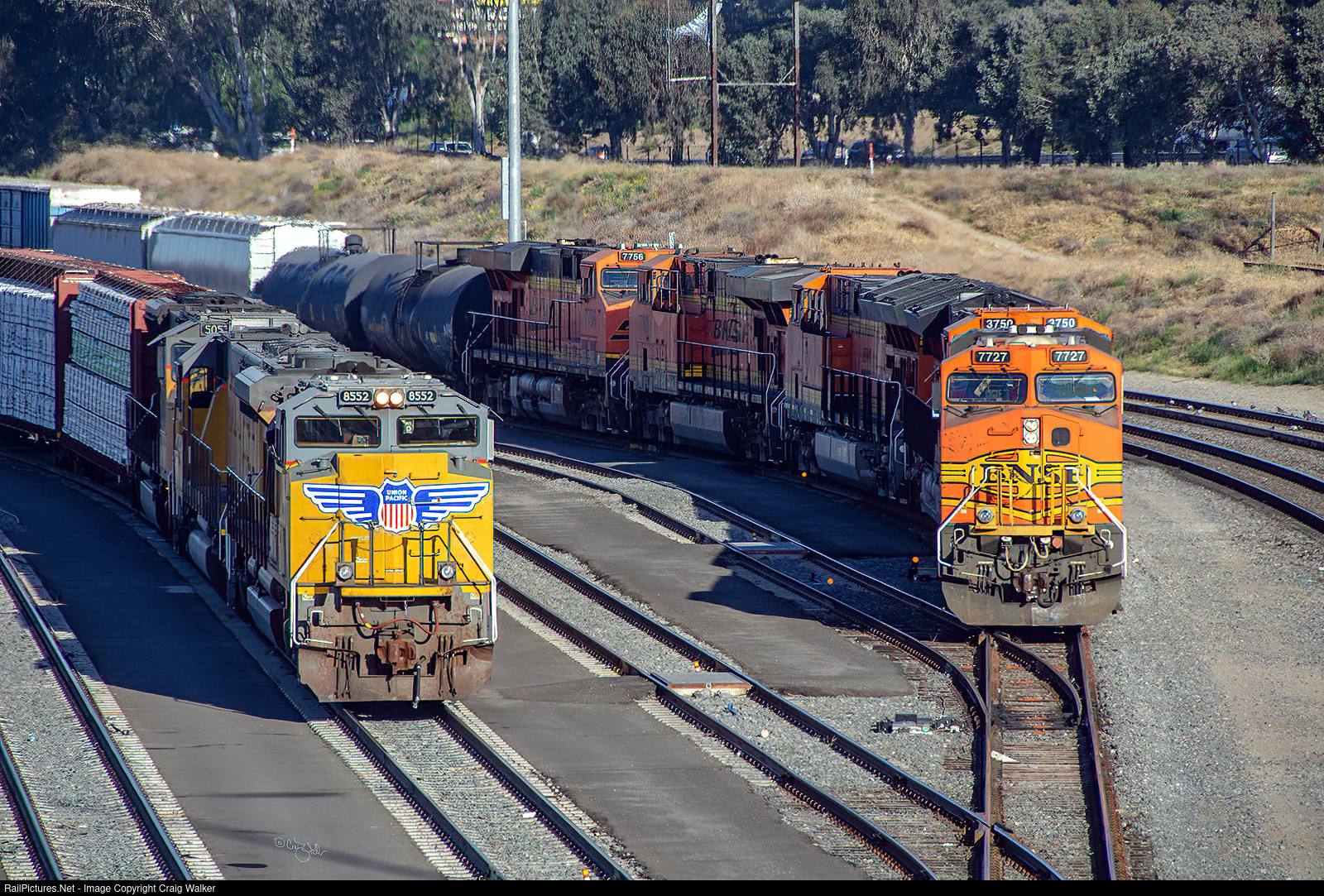 BNSF ES44DC 7727 and train H-WCLBAR1-20, however, will, as with all other BNSF trains departing here, head to Barstow, where its cars will be broken up and assigned to new trains heading east … or, as with UP, perhaps north. (Colton, California – April 21, 2018)
