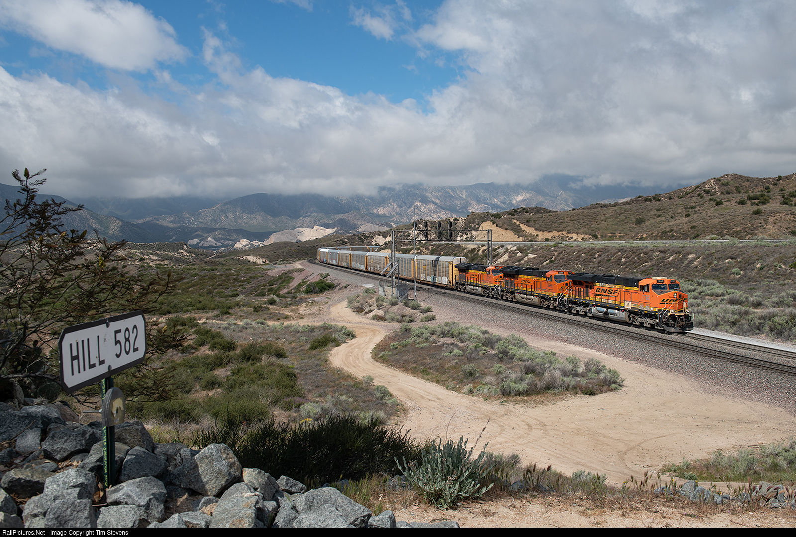 BNSF ES44DC 7760 climbs Cajon Pass with a vehicle train for Barstow in tow. They're passing "Hill 582" which is a very beautifully taken care of Railfan lookout.