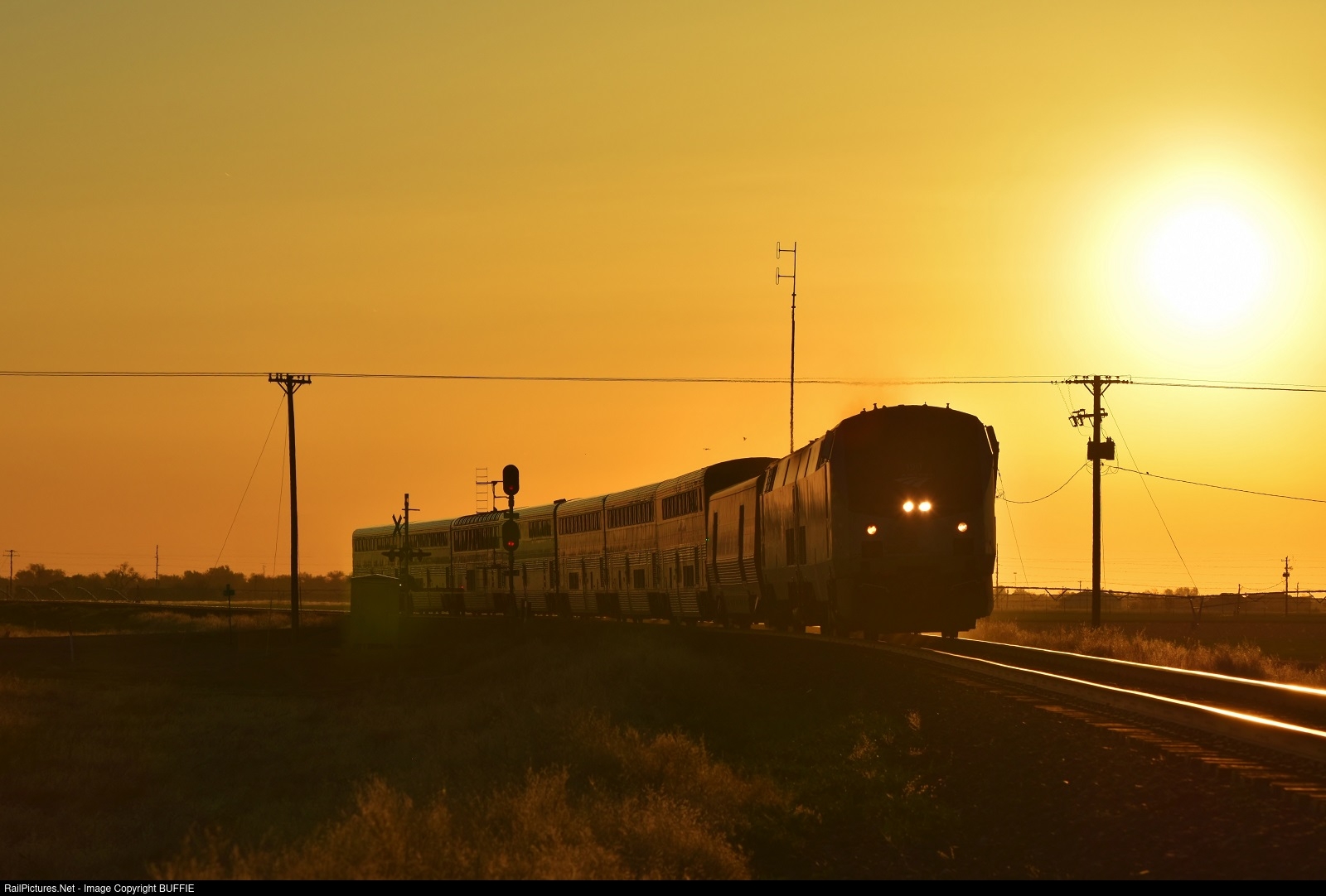 A golden sunrise catches the California Zephyr running through Wiggins, Colorado on the Brush Sub.