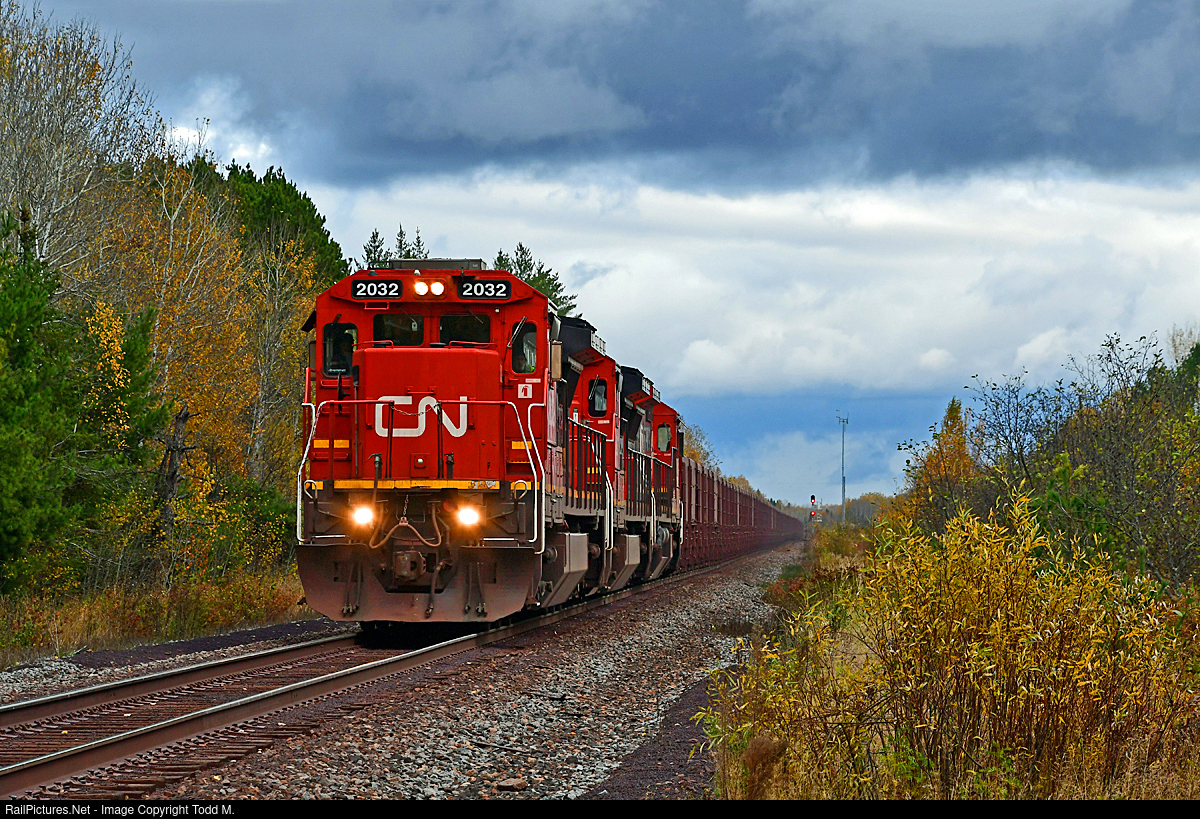 | Coming up from Two Harbors having just crossed over the Ramshaw diamond and about to come off the Iron Range Sub, CN 2032 is going to Minntac to loads iron ore pellets on a dreary fall afternoon. |