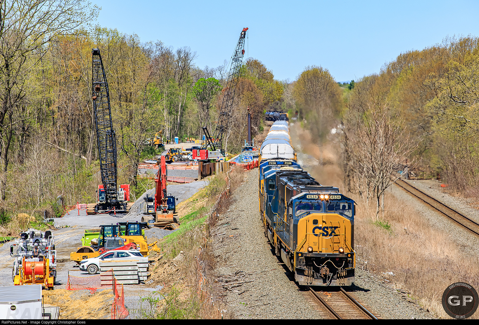 With a MAC & GEVO duo, X566 slithers through French's Hollow rolling through the Kiewit working limits along Track 2. CSX 4534 & 4553 both non-flared MAC's were in-charge that early afternoon.