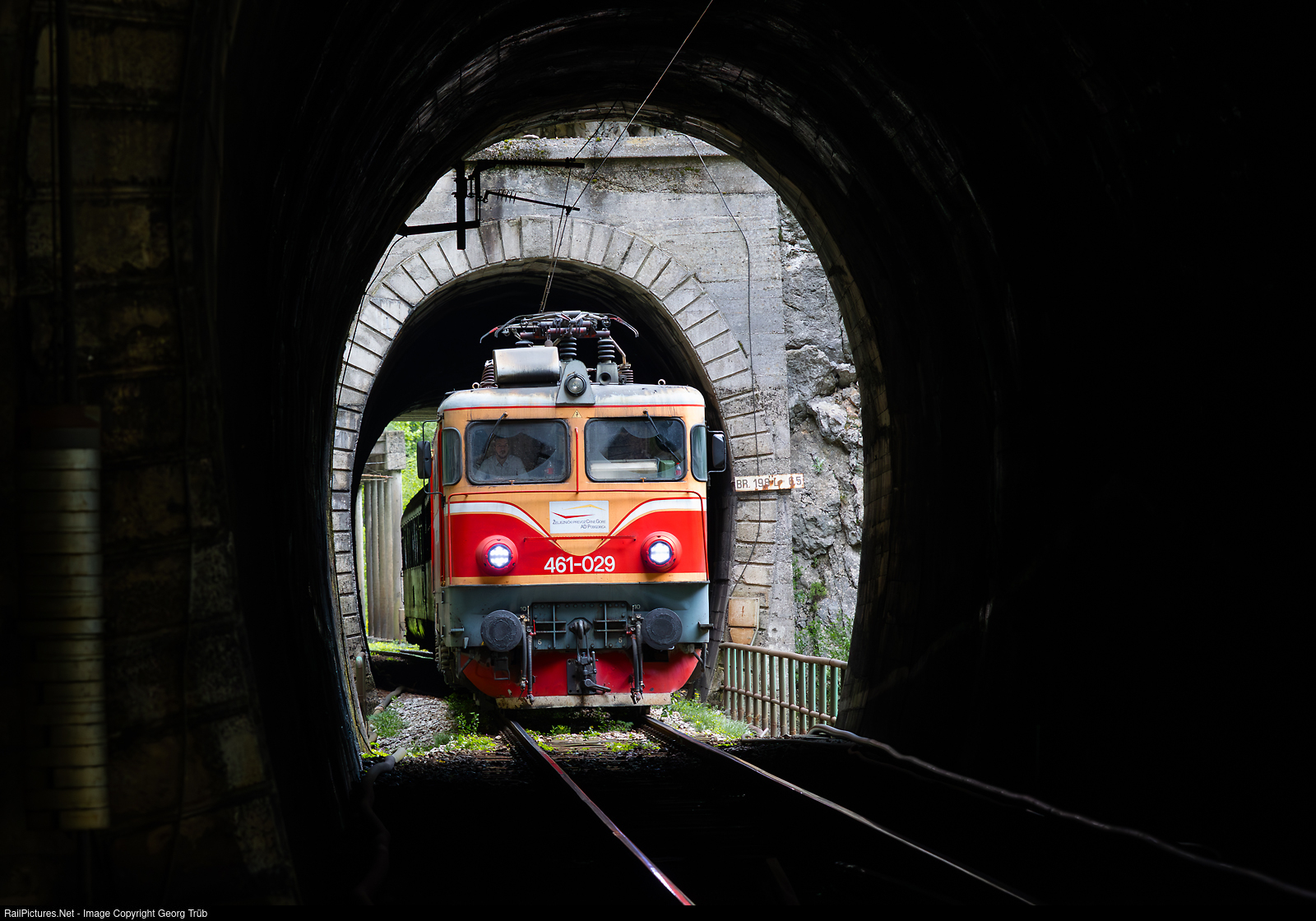 Charter train for SERVRAIL from Switzerland on the Bar to Beograd mountain line, from Bar till Bijelo Polje, border station to Serbia (158 kilometer), near the Kruševacki Potok railway stop deep in the Morace canyon between Lutovo and Trebešica. This spectacular photo stop was organized by our guide Dragan from Serbia. Sixaxle electrolocomotive 461 # 029 of the ZPCG Railways Montenegro built by Electroputere in Romania about 1971/1973, with 5400 kW from 25000 V 50 Hz, is leaving the 65 meter long tunnel # 198 to enter the 40 meter long tunnel # 199, followed by the very short Kruševacki Potok stop in a gallery.
