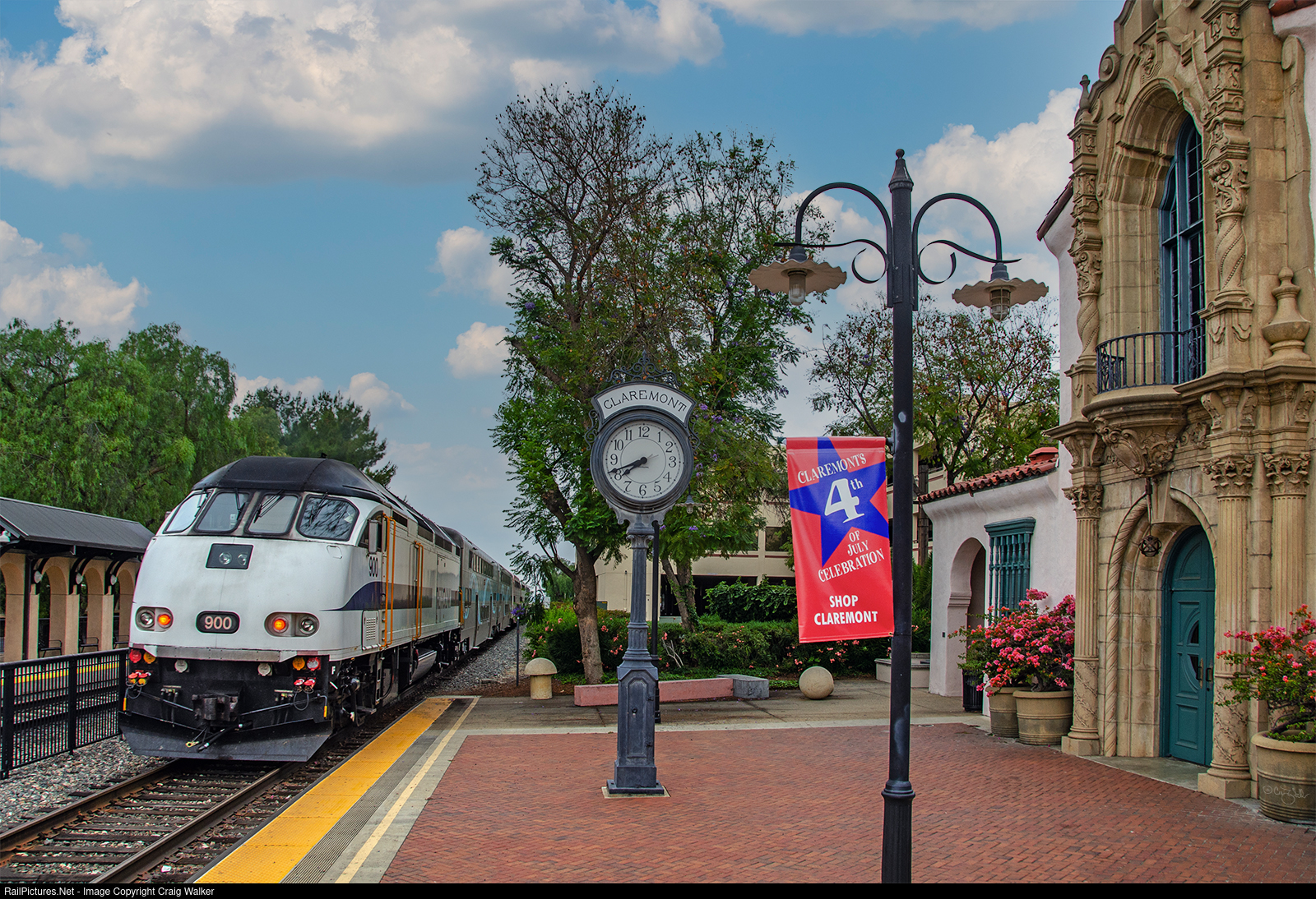 Metrolink San Bernardino Line train 351, with MP36PH-3C 900 shoving on the rear, departs the Claremont station on its way from San Bernardino to Los Angeles.