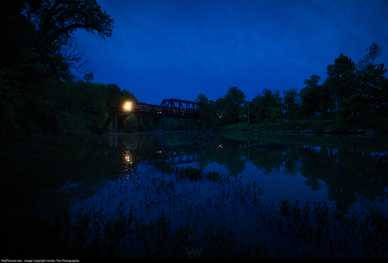| As the heavily-clouded sky grows lighter on the rainy morning of Sunday, May 18, 2025, an empty CPKC coal train heads north across the Illinois River near Watts, OK.
