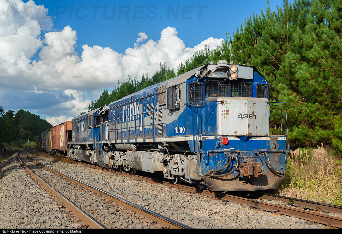 Former RFFSA EMD G22U No. 4361, now operated by Rumo, leads a train of empty freight cars through Lineo do Amaral Yard in Ponta Grossa, Paraná, on the afternoon of May 18, 2025. The train originated in São Francisco do Sul, SC, and is heading northtbound on the Tronco Principal Sul mainline toward Desvio Ribas Yard, framed by rows of pine trees and a sky filled with towering clouds.