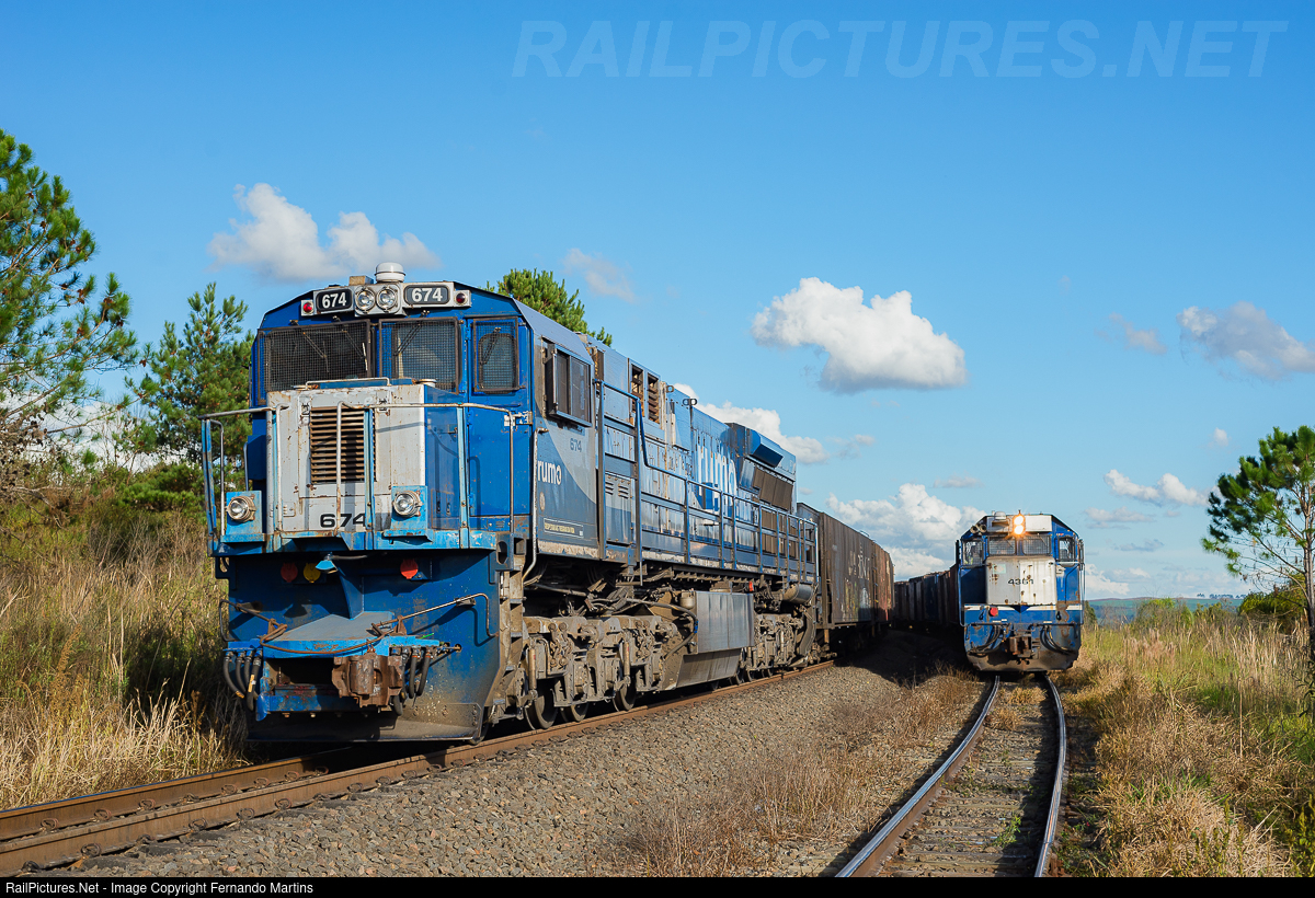 Rumo Logística’s GE ES43BBi no. 674 brings up the rear of a southbound freight as a DPU (Distributed Power Unit) at Lineo do Amaral yard in Ponta Grossa, Paraná, on May 18, 2025. Meanwhile, classic EMD G22U no. 4361 stands by on the siding, waiting for the main to clear.