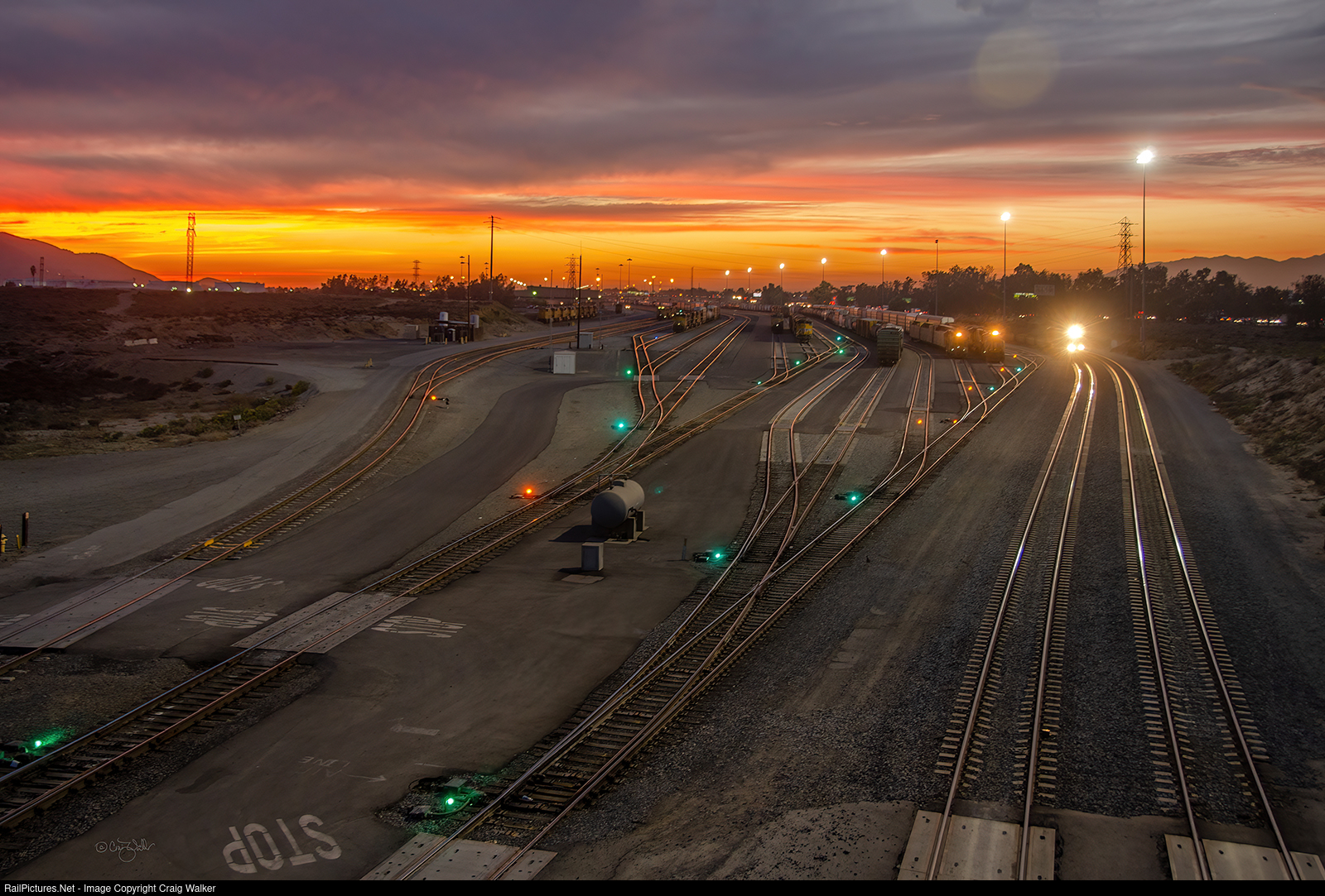 At 6:05 pm (18:05) on a November evening, an impressive sunset gives the yard a beautiful appearance as the fading light reflects off the well-used rails, combined with the illuminated switch indicators – along with the headlights of an eastbound freight train approaching on the UP's Alhambra Sub. (Colton, California – November 15, 2016)