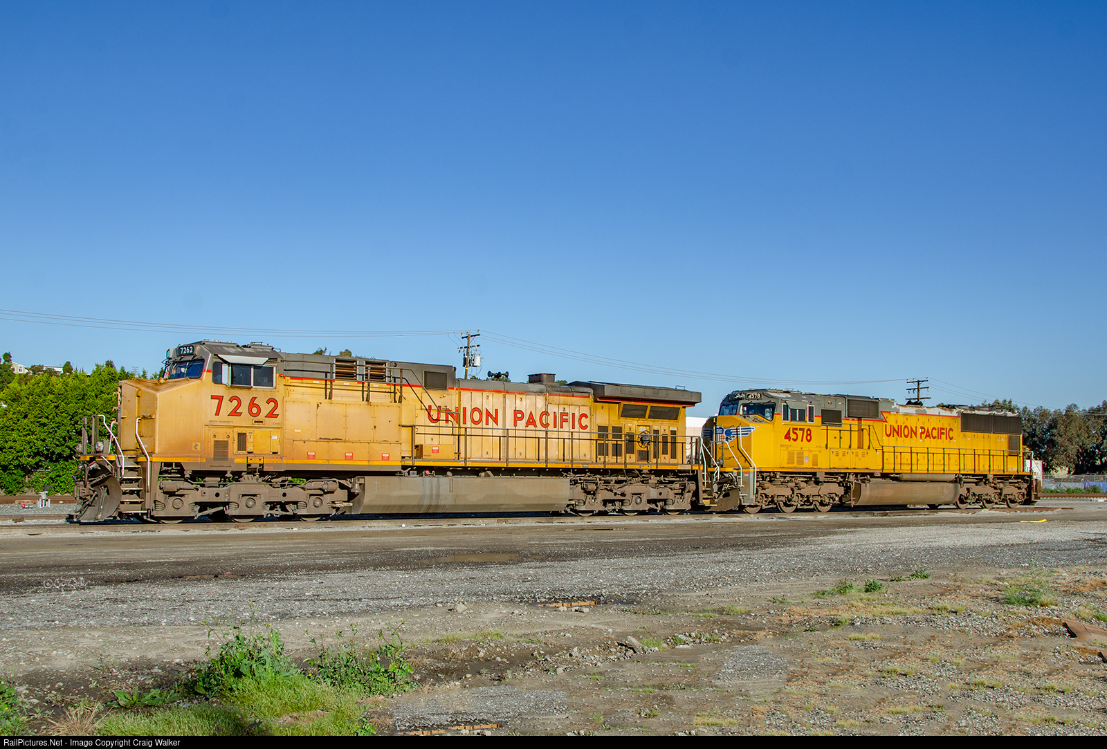 Idling on the Union Pacific's Dolores Industrial Lead, where power recently arrived from westbound trains sits awaiting their next assignment, are UP AC4400CW 7262 (built by GE in August 1999) and SD70M 4578 (built by EMD in March 2001).