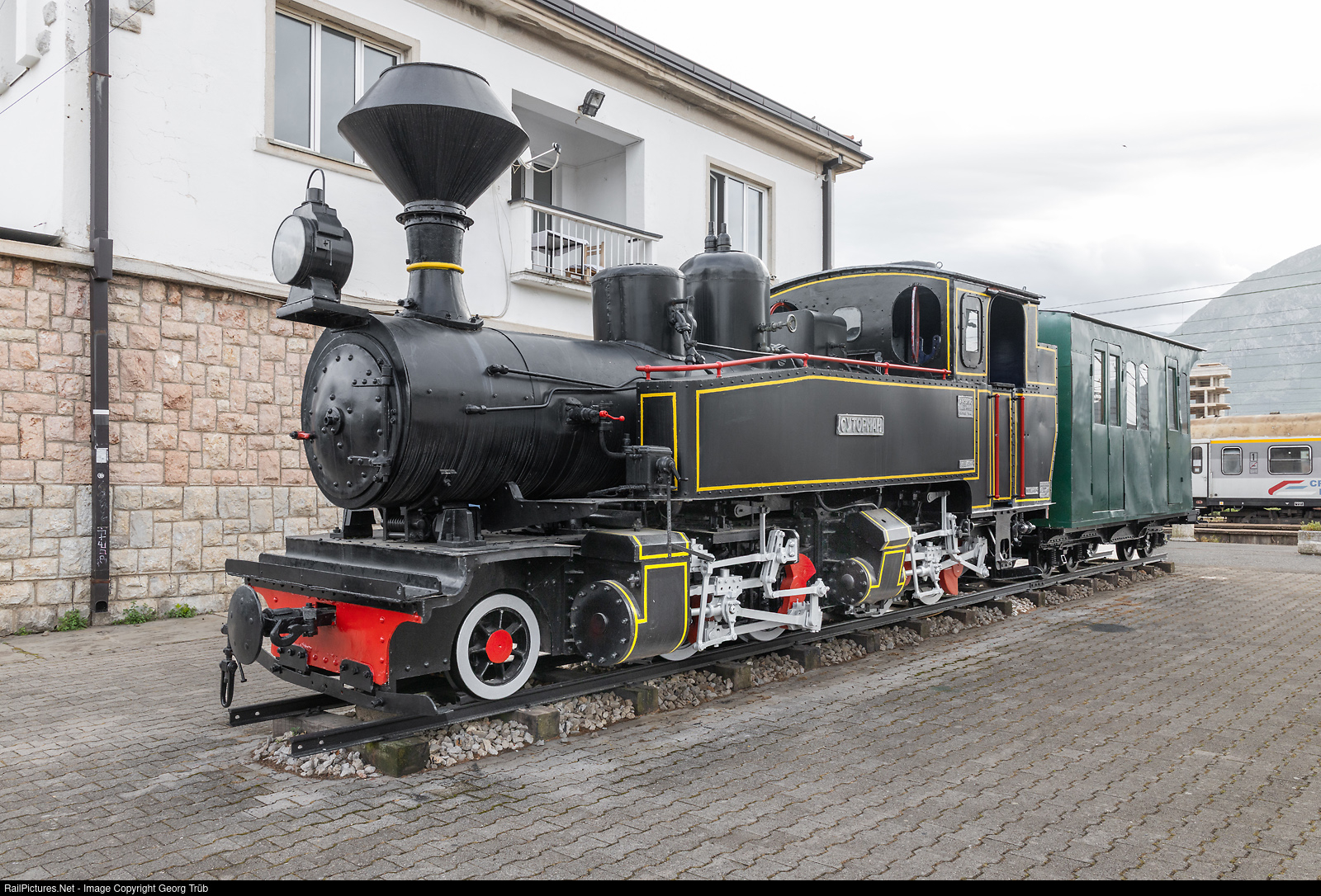 750 mm narrow gauge "Mallet" 2-4-4 named SUTORMAN of the former Antivari railway from Bar to Virpazar built by Borsig/Berlin in 1910, exhibited in front of the Bar railway station. The Antivari railway was opened in 1908 and was operational till 1960, replaced by the new standard gauge railway between Bar and Podgorica.