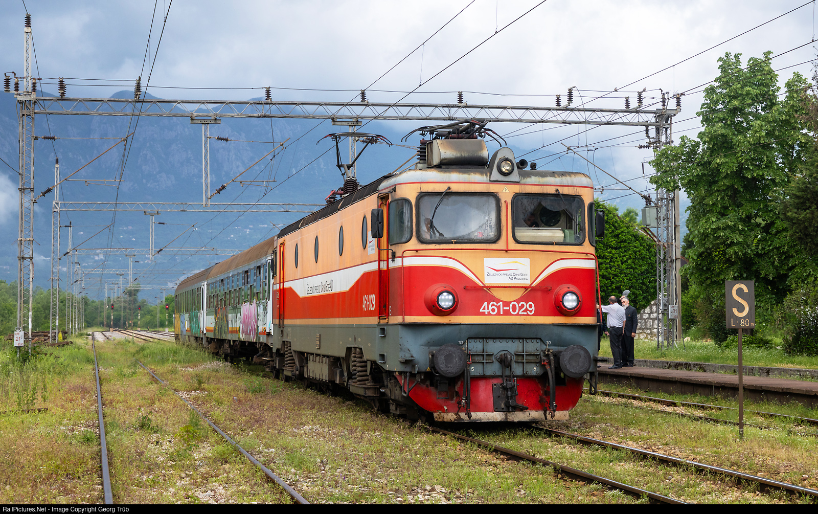 The extra train for SERVRAIL from Switzerland on the Bar to Beograd mountain line, from Bar till Bijelo Polje, border station to Serbia (158 kilometer), stopped in Virpazar for the crossing with regional train 6153 from Podgorica to Bar. Sixaxle electrolocomotive 461 # 029 of the ZPCG Railways Montenegro built by Electroputere in Romania about 1971/1973, with 5400 kW from 25000 V 50 Hz AC.