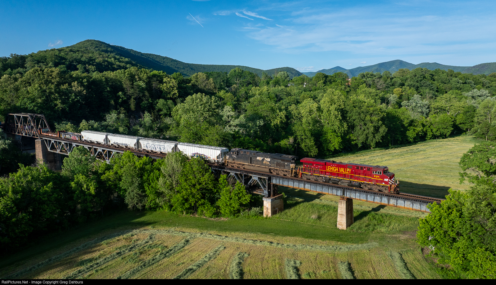 | 15T heads over the former C&O main, the James River and some freshly cut fields on a beautiful evening with the "Lehigh Valley" heritage unit leading. This unit was recently cleaned up and looks much better than it has in recent memory. |