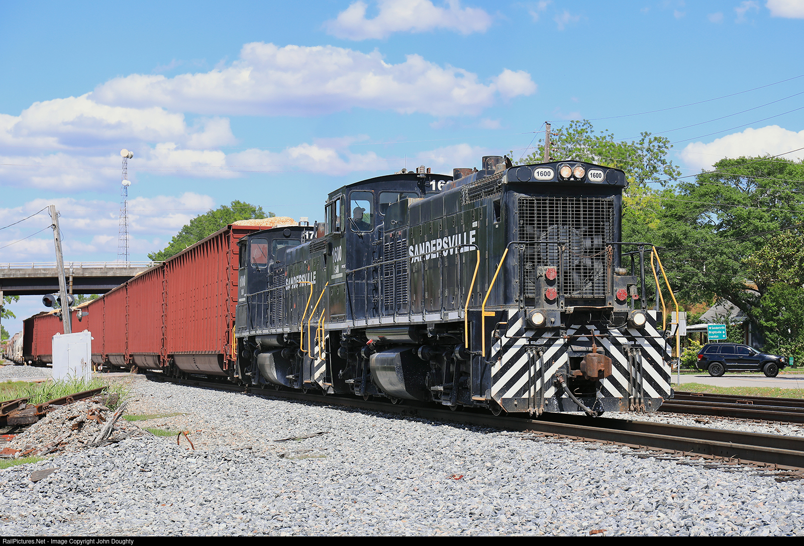 | Sandersville 1700 and 1600 bring a long string of cars to interchange with the Norfolk Southern in Tennille, Georgia. |