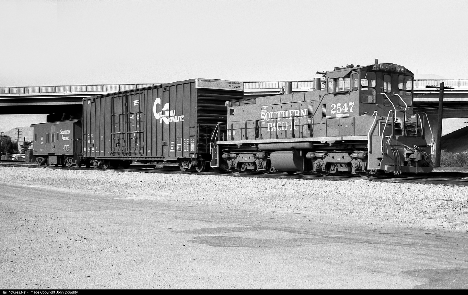 Southern Pacific 2547 takes a boxcar and caboose towards the SP yard in Anaheim, California.