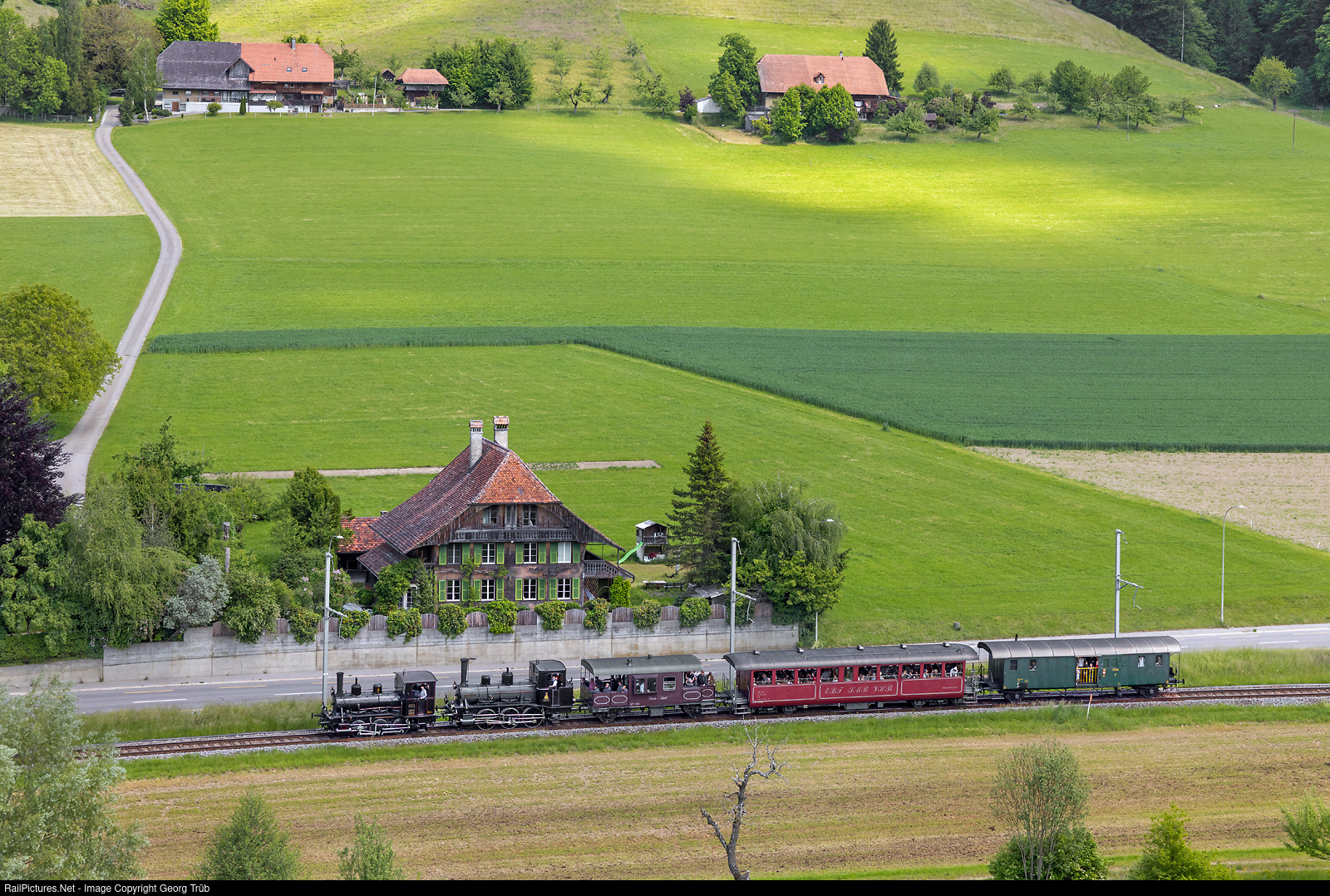 Extra steam train 31709 from Langnau im Emmental to Konolfingen on the occasion of the celebration of 150 years of the Emmental Railway. Between Bowil and Zäziwil, E 3/3 # 853 (built in 1890) of the association Bern Steam Railway (DBB) and Ed 3/3 # 3 LANGNAU from 1881, on loan from the Swiss Museum of Transport, pull the full train.