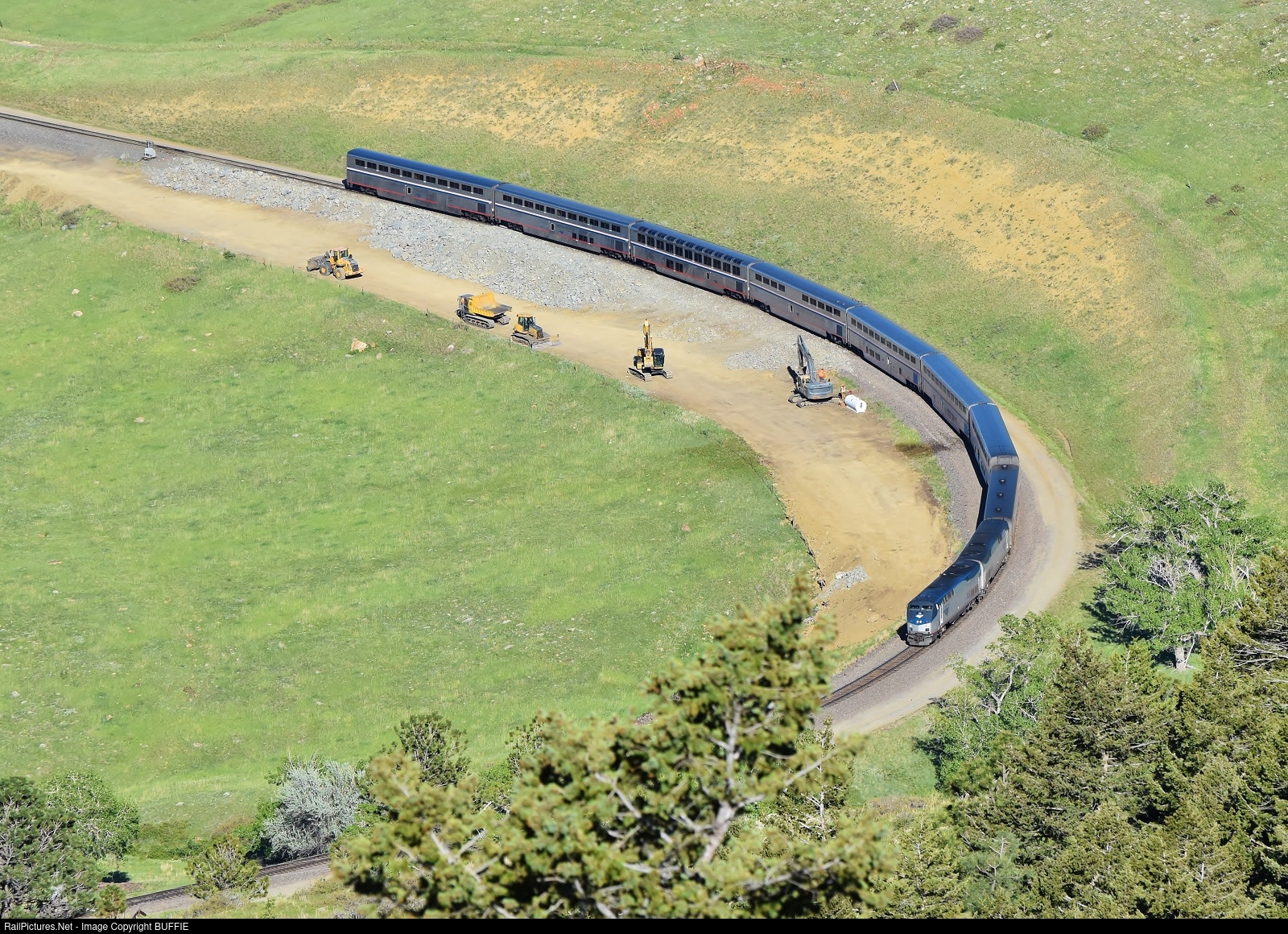The California Zephyr passes maintenance equipment working on the Big Ten Curve in Rocky, Colorado.