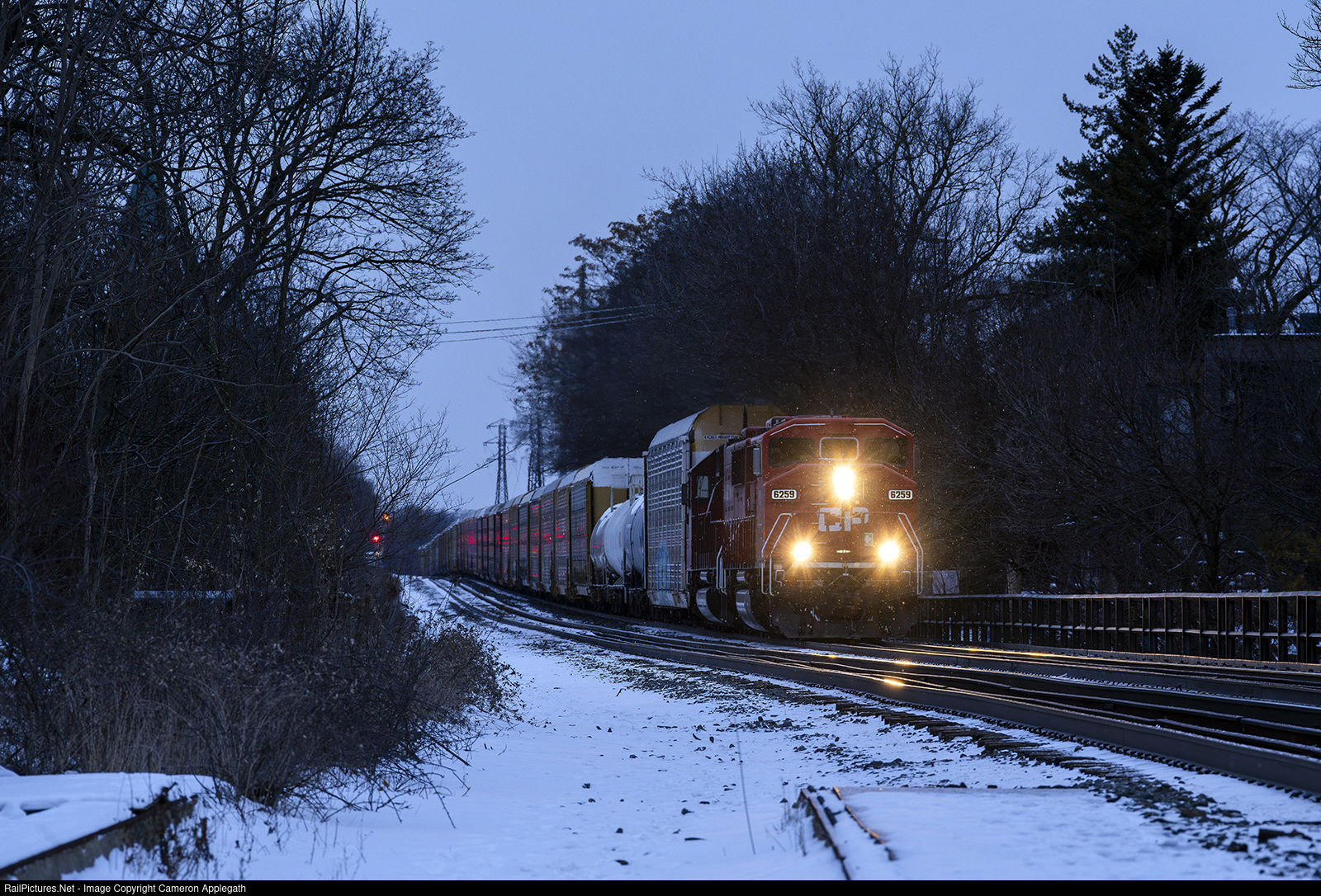 | The tail end of CP's H17 job rolls through Mount Pleasant on the North Toronto Sub in the Rosedale neighbourhood of the city on a chilly and snowy January evening, loaded with fresh Honda's for delivery. This guy had air pressure issues at Weston on the Mactier Sub which held the train up for a few hours, leading to me shooting him at dusk as opposed to the middle of the day with better light. Good to see SD60M's still earning their keep in 2025. |