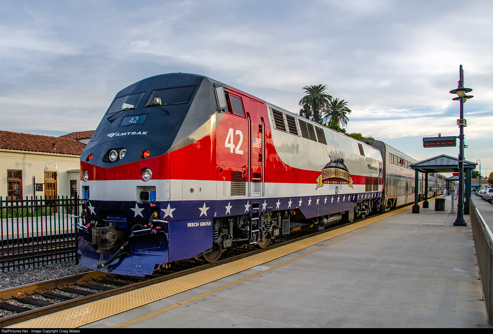 DEcember days are short, and as Amtrak Pacific Surfliner Weekend Service train 580 arrives at the Orange station at 3:45 pm (15:45) the sun is already very low in the sky ... but providing decent light on Amtrak P42DC 42's trucks! In case it isn't obvious, this locomotive is Amtrak's homage to our country's military veterans. (Orange, California – December 8, 2013)