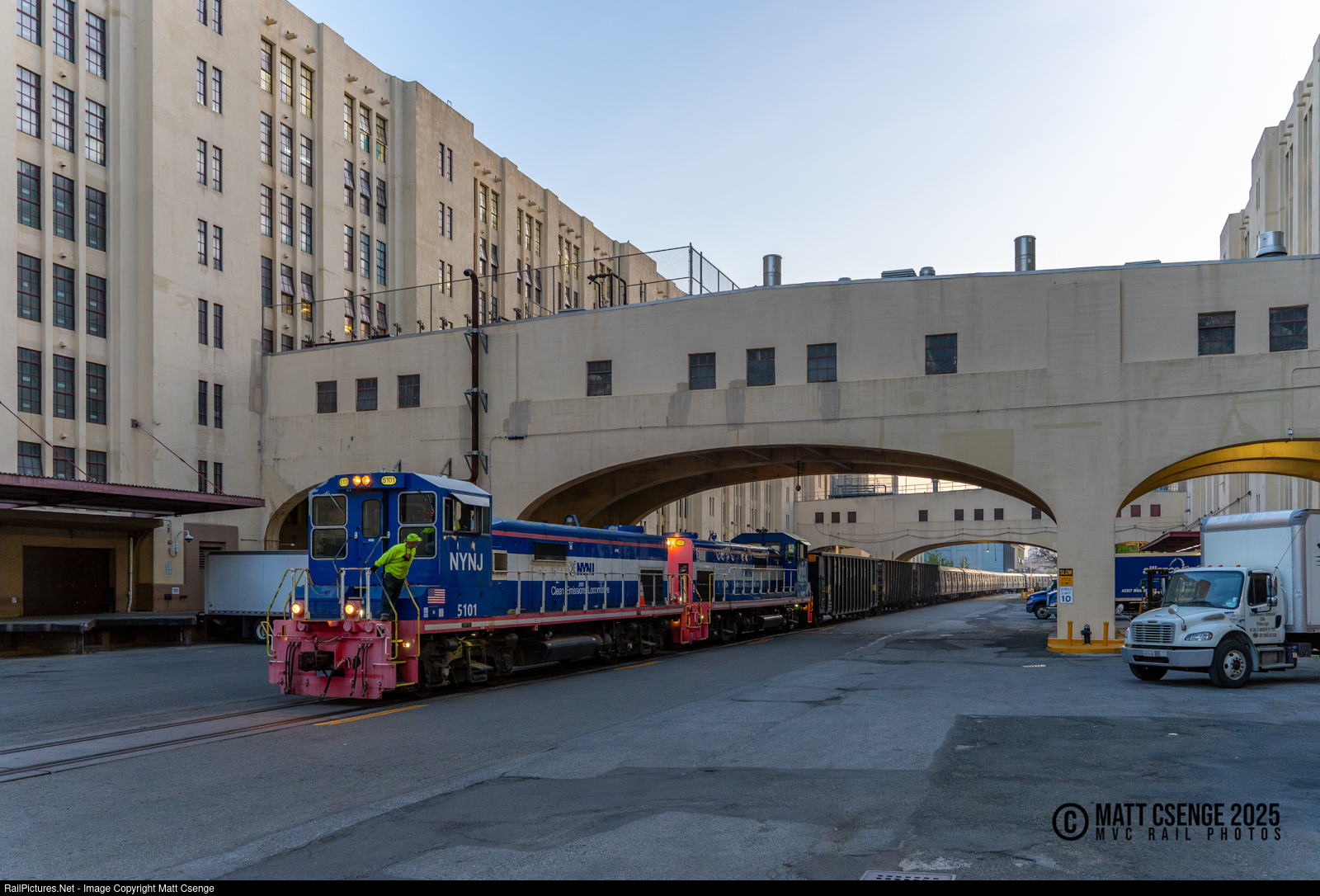 NYNJ Rail SE10B no.s 5101 and 5103 are seen hauling a mixed train through the Brooklyn Army Terminal on their way back to the 65th Street Yard. The first three cars in the train are carrying processed scrap metal from Sims Municipal Recycling, while the last eight cars of the train are R46 NYC subway cars that are being sent out for scrapping at the Sims facility in Jersey City. |