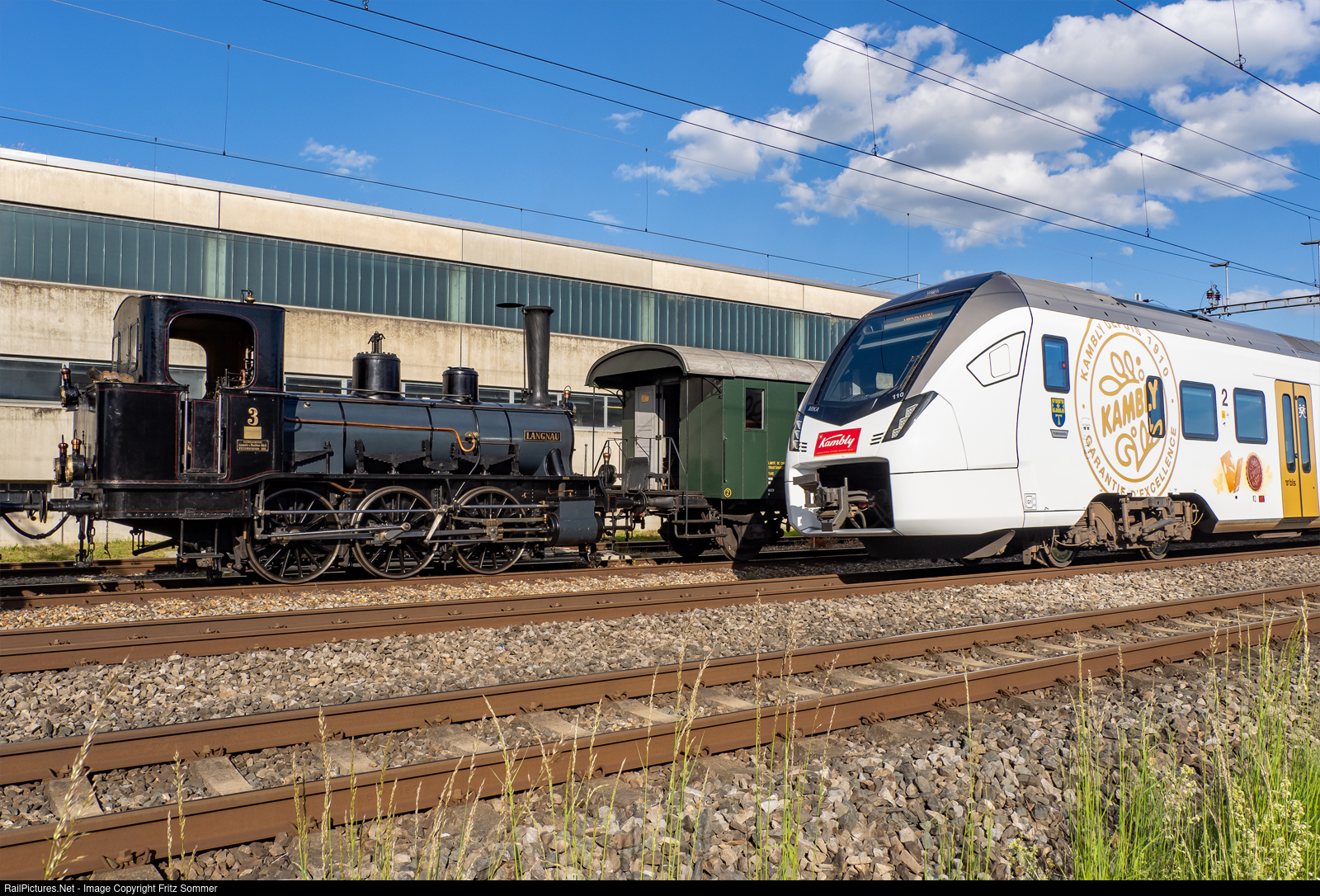 On the occasion of the anniversary “150 years of the Emmental Railway” on May 17 and 18, 2025, there was a lot going on on the tracks of the Emmental! On the evening before the event, the oldest and newest representatives of this railroad history happened to meet briefly at the BLS workshop in Oberburg: on the left in the picture is the steam locomotive “Langnau” Ed 3/3 No. 3, built in 1881, and on the right in the picture is the passing multiple railcar unit “MIKA” RABe 528 110 with Kambly advertising in Regio-Express design.