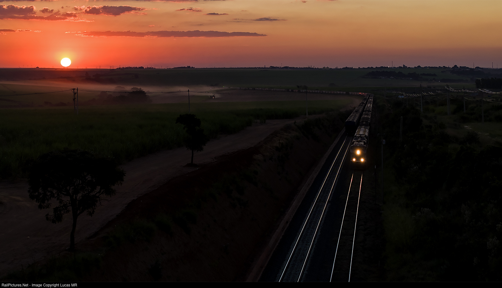 | The sun is about to set as southbound train I18 meet a northbound empty at Km 213,5 near São Carlos. |