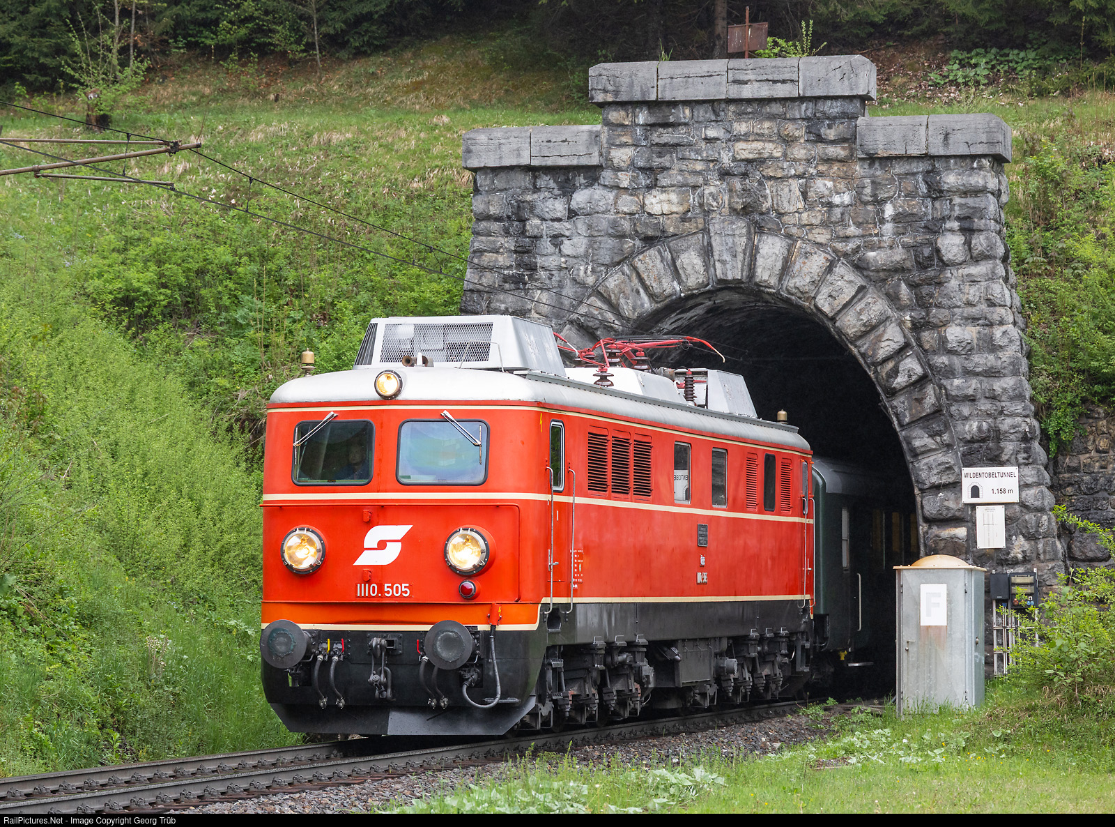 The former austrian railways ÖBB sixaxle electrolocomotive 1110 # 505, now owned and operated by assosiation Pro Bahn Vorarlberg, is leaving the 1158 meter long Wildentobel tunnel on the Arlberg west ramp between Langen am Arlberg and Wald am Arlberg on the occasion of a C.K. photo event. This tunnel was built 1912 to 1914 during a line reconstruction. The 1110 # 505 with 5440 Hp was built in 1957 by SGP Werk Graz mainly for the Arlberg line.