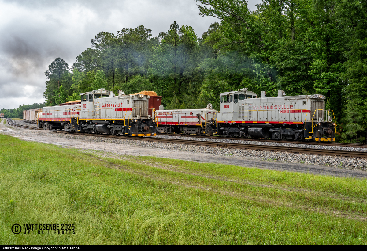 Sandersville Railroad SW1500 no.s 1100 and 1500 are seen working the railroad's yard outside Tennille, GA on a cloudy afternoon. The locomotives are paired with slugs - or "boosters," as the railroad refers to them - no. 90 with 1500 and 91 with 1100. The former is originally a Rock Island slug built by GE, whereas the latter was purchased from Norfolk Southern. |