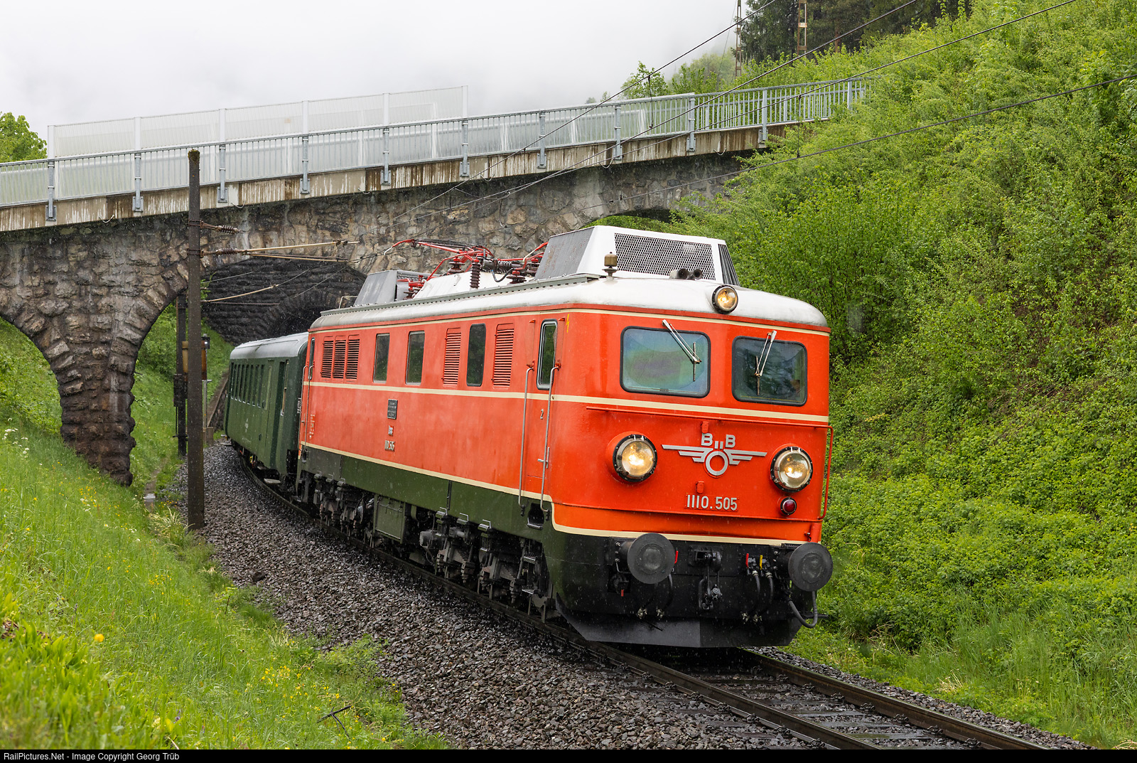 | The former austrian railways ÖBB sixaxle electrolocomotive 1110 # 505, now owned and operated by assosiation Pro Bahn Vorarlberg, is running up the Arlberg west ramp between Braz and Hintergasse with a C.K. photo charter train. The 1110 # 505 with 5440 Hp was built in 1957 by SGP work Graz mainly for the Arlberg line. |