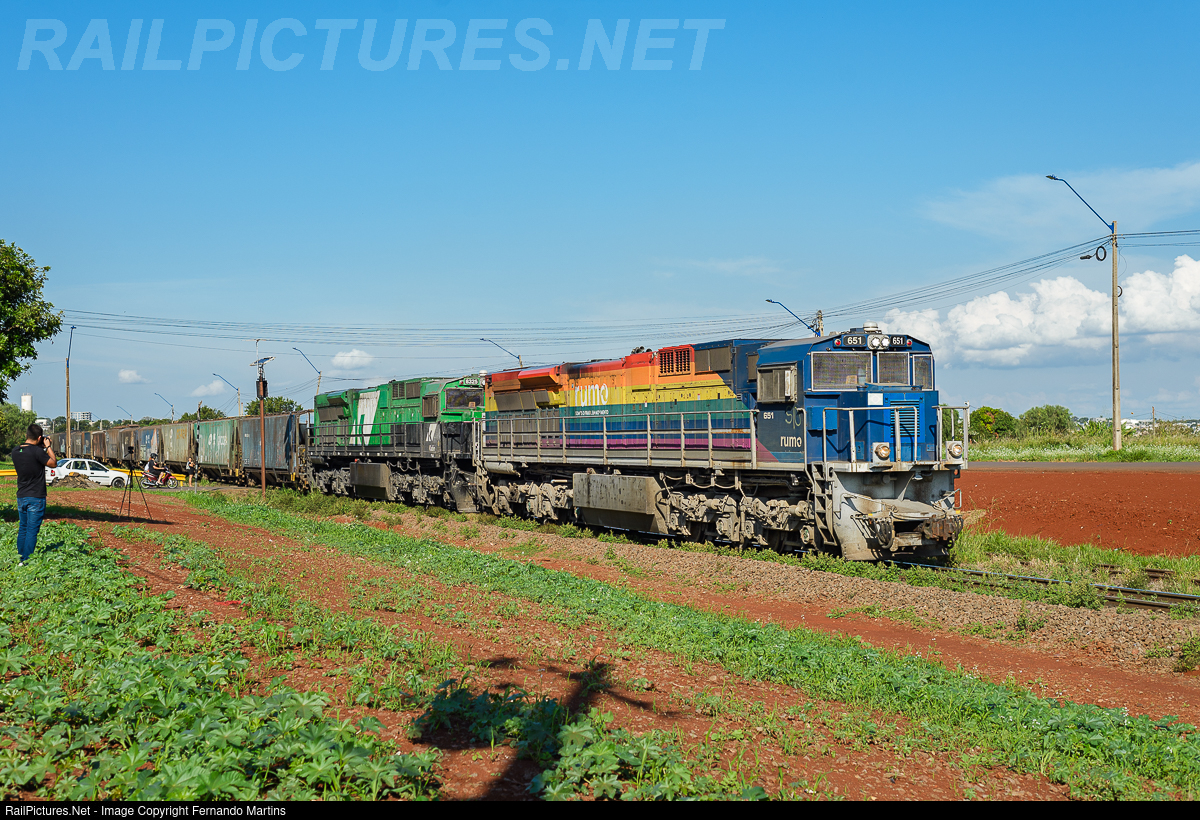 | Rumo Logística's southbound freight, helped by GE ES43BBi No. 651 in Marialva, PR, heads along the main line to Paranaguá, PR. |
