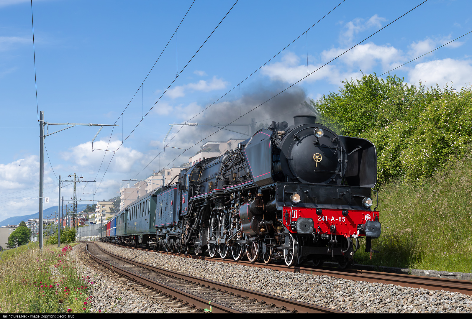 | The large former french railway SNCF fourcylinder compound express train 4-8-2 steamlocomotive 241 A # 65 of the association Dampflokdepot Full (DDF) pulls the 7 car train 31721 from Neuchâtel via Biel to Lyss, between Neuchâtel and St-Blaise CFF. This was a charter train for donators. |