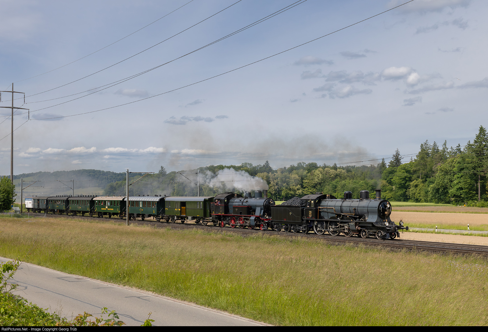 A very nice long passenger train, on its way between Birr and Mägenwil as a club trip of the Dampfbahn Verein Zürcher Oberland (DVZO). The A 3/5 # 705 from SBB Historic, on permanent loan to the Dampfgruppe Zürich (VDZ) association, and the Eb 3/5 # 9 formerly Bodensee-Toggenburg-Bahn of the Dampfloki Club Herisau, operated by the DVZO, together pull train 31713 from Brugg AG via Mägenwil-Baden Oberstadt-Wettingen to Zürich HB, between Birr and Mägenwil. The first and third carriages were recently extensively overhauled. The list of the consist: Baggage car F # 948 former Bern-Lötschberg-Simplon (Thunerseebahn) of the Dampfgruppe Zürich (VDZ). Third class privately owned C # 5820 "Thurgauer Stube". Third class C2 # 422 of the DVZO former Bodensee-Toggenburg-Bahn (BT), Third class # C 6075 and # 6109 of the DVZO. Mixed baggage/mail car FZ # 203 of the DVZO. "Feldschlösschen Rheinfelden" brewery covered freight car for beer.