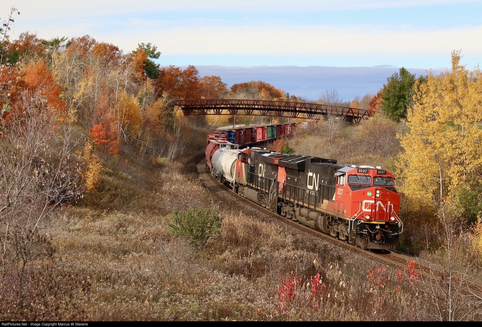 The autumn colours are beginning to faded but are still impressive as a CN westbound leans into the curve at mile 30.