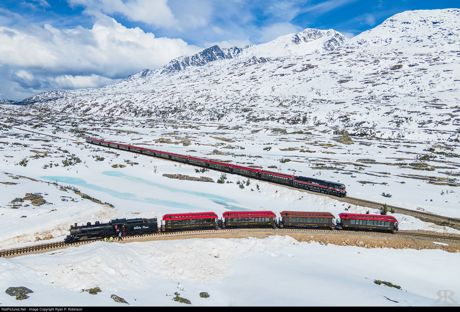| The White Pass & Yukon Route's only operable steam locomotive, number 73, has just conquered White Pass for the first time in 2025. Crews spent the day making two test trips up the pass, with the second trip making it to the summit. The locomotive is being looked over while the southbound Fraser train passes them at Divide. |