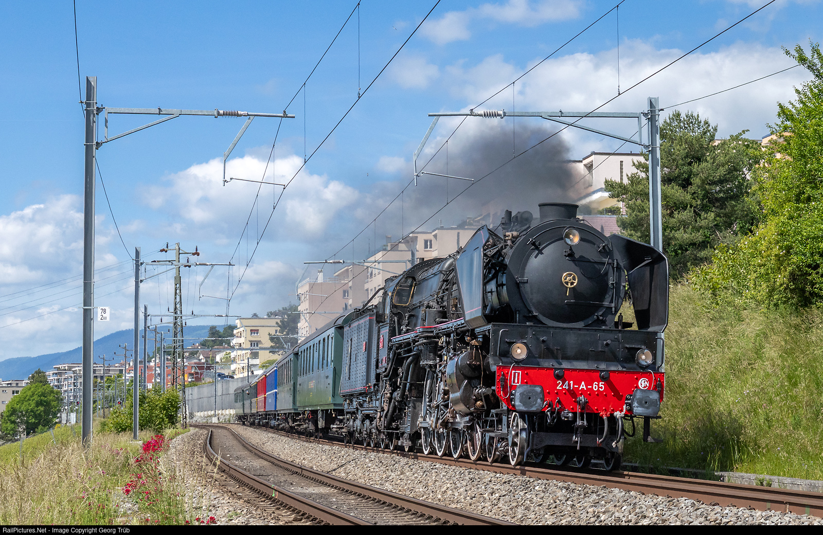 | The large former french railway SNCF fourcylinder compound express train 4-8-2 steamlocomotive 241 A # 65 of the association Dampflokdepot Full (DDF) pulls the 7 car train 31721 from Neuchâtel via Biel to Lyss, between Neuchâtel and St-Blaise CFF. This was a charter train for donators. |