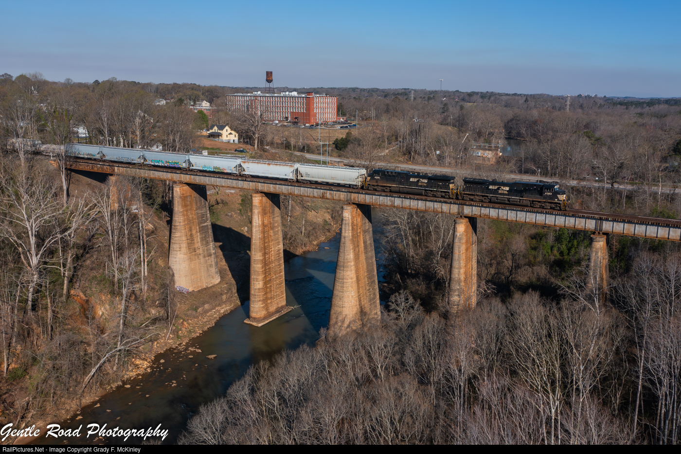 | Train 154 spans the Pacolet River at Converse, SC. Smoke from western North Carolina wildfires can be seen in the distance near Columbus, NC. |